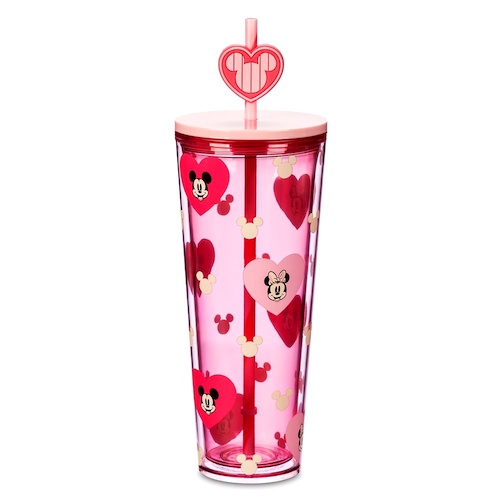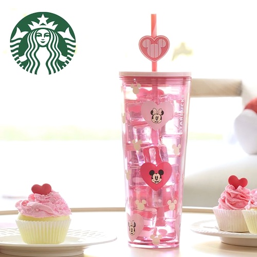 - Disney Store and Starbucks are here to help you along with the latest must have tumbler to roll in in for the season. Guests will be dazzled by the pretty transparent pink cup that comes with a twist-on lid and matching reusable straw complete with a heart icon accessory.