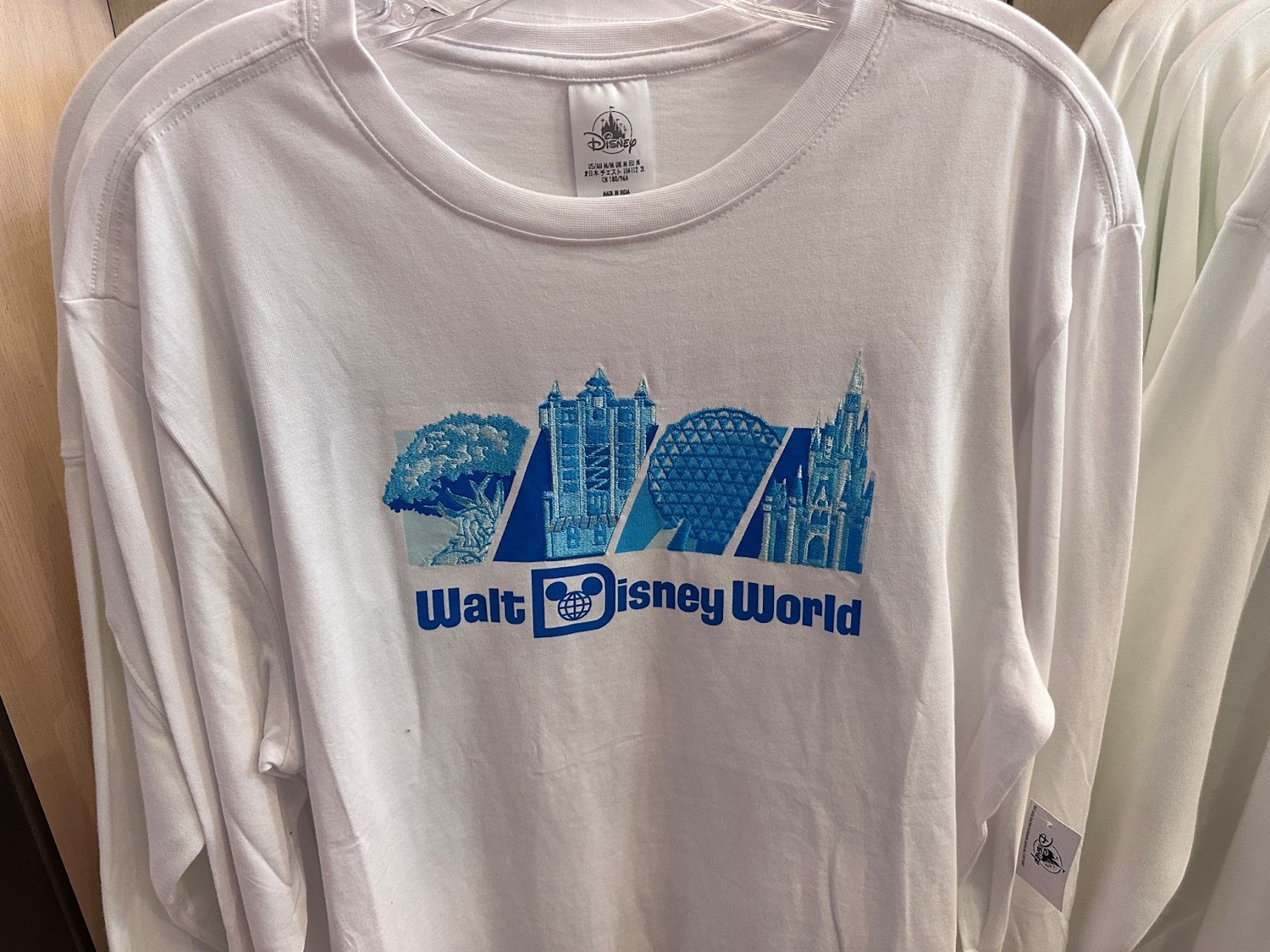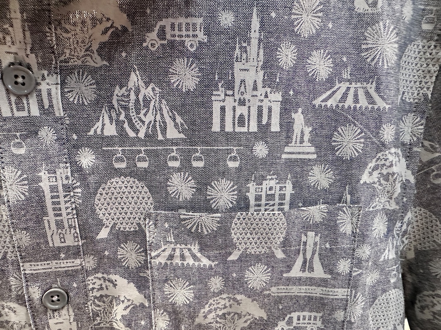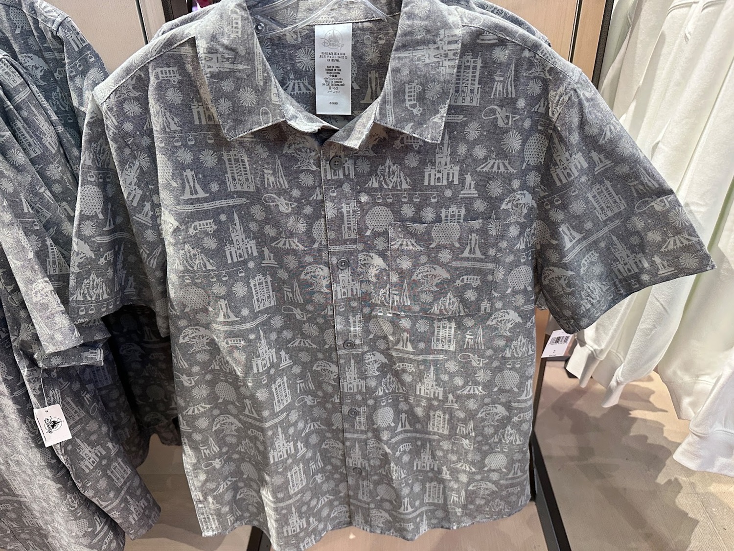 • Lastly, there’s a wonderful, gray button-up shirt that features the four main park icons, alongside a number of other iconic elements from throughout Walt Disney World.