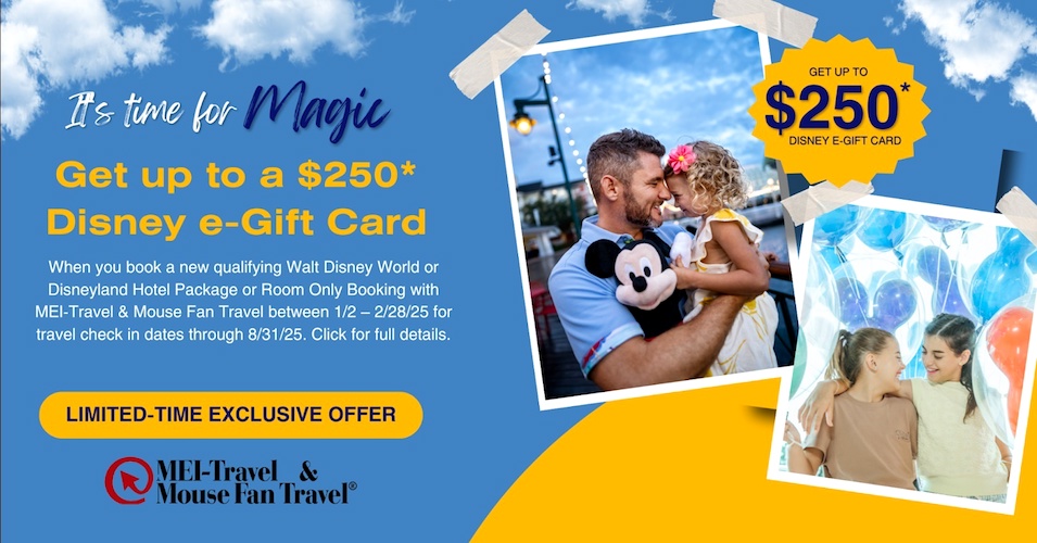 With 2025 upon us, Disney has begun to introduce a slew of new offers for vacation packages to Disneyland, Walt Disney World, and more. Our travel partners at Mouse Fan Travel have also launched a new exclusive offer of their own, giving you up to a $250 Disney e-gift card when booking a qualifying vacation.