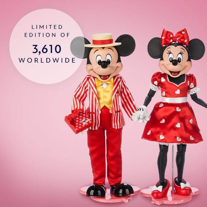 Over the past few years, Disney has been presenting limited edition Mickey Mouse and Minnie Mouse doll sets in honor of milestone anniversaries like Disney100 or special holidays. Well this winter a new collection has arrived on shopDisney and the adorable duo have dressed up to celebrate Valentine’s Day.