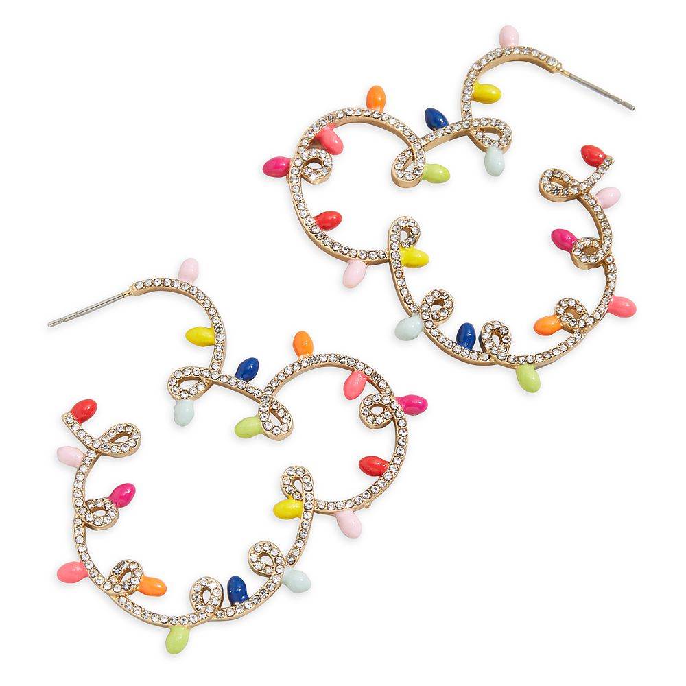 - Another favorite is the Mickey Mouse silhouette hoop earrings that are elegantly thin and decorated with a string of lights.