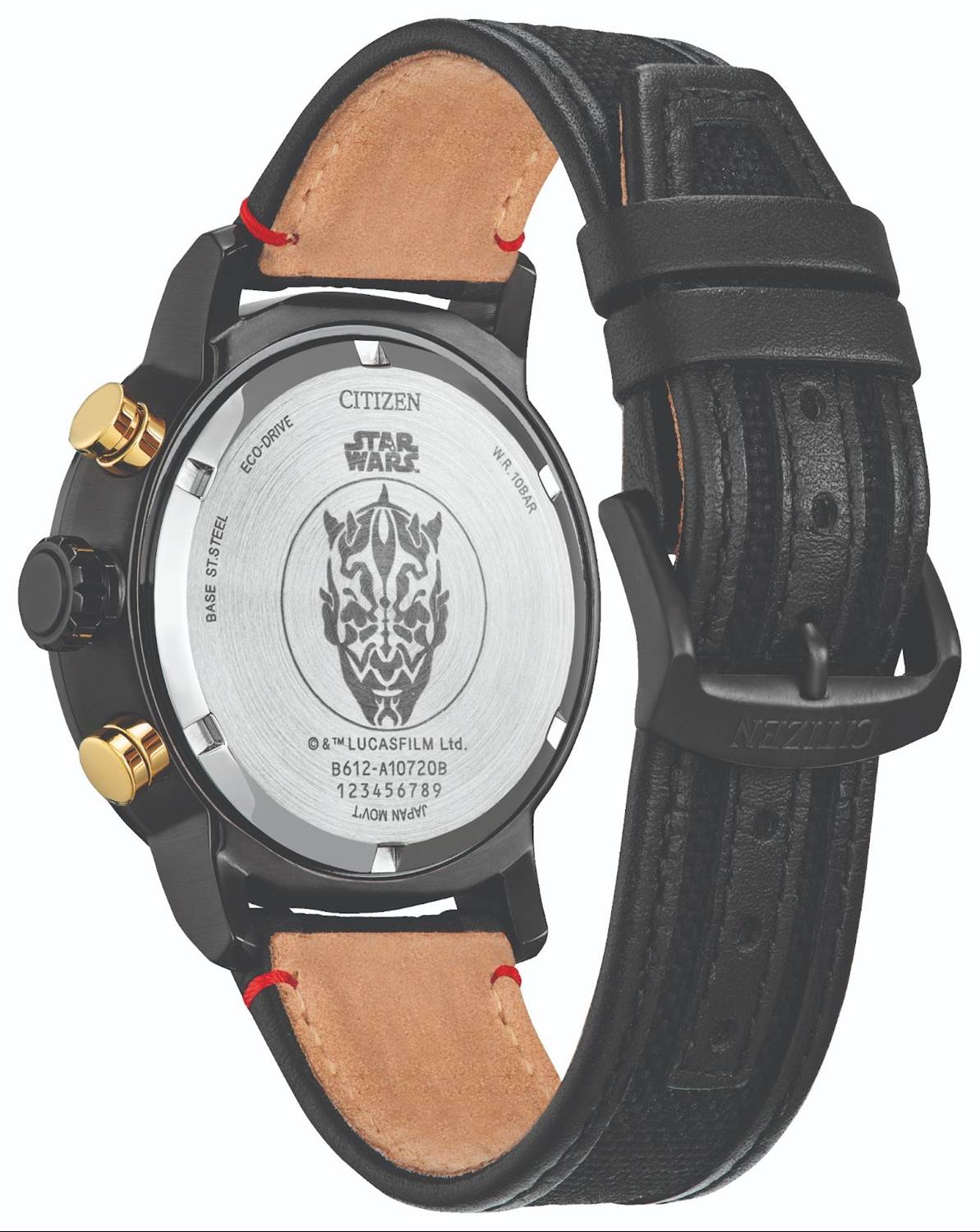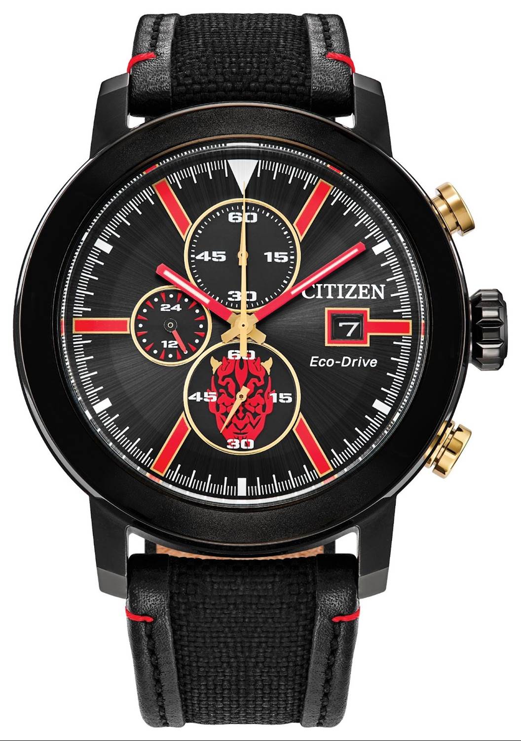 Darth Maul is featured on a striking timepiece ($300), which “features the infamous warrior's distinctive red and black markings, yellow horns on the dial, and black ion-plated stainless steel band. This collector’s watch has a 1-second chronograph, a convenient date display, and an etching of Darth Maul on the case back."