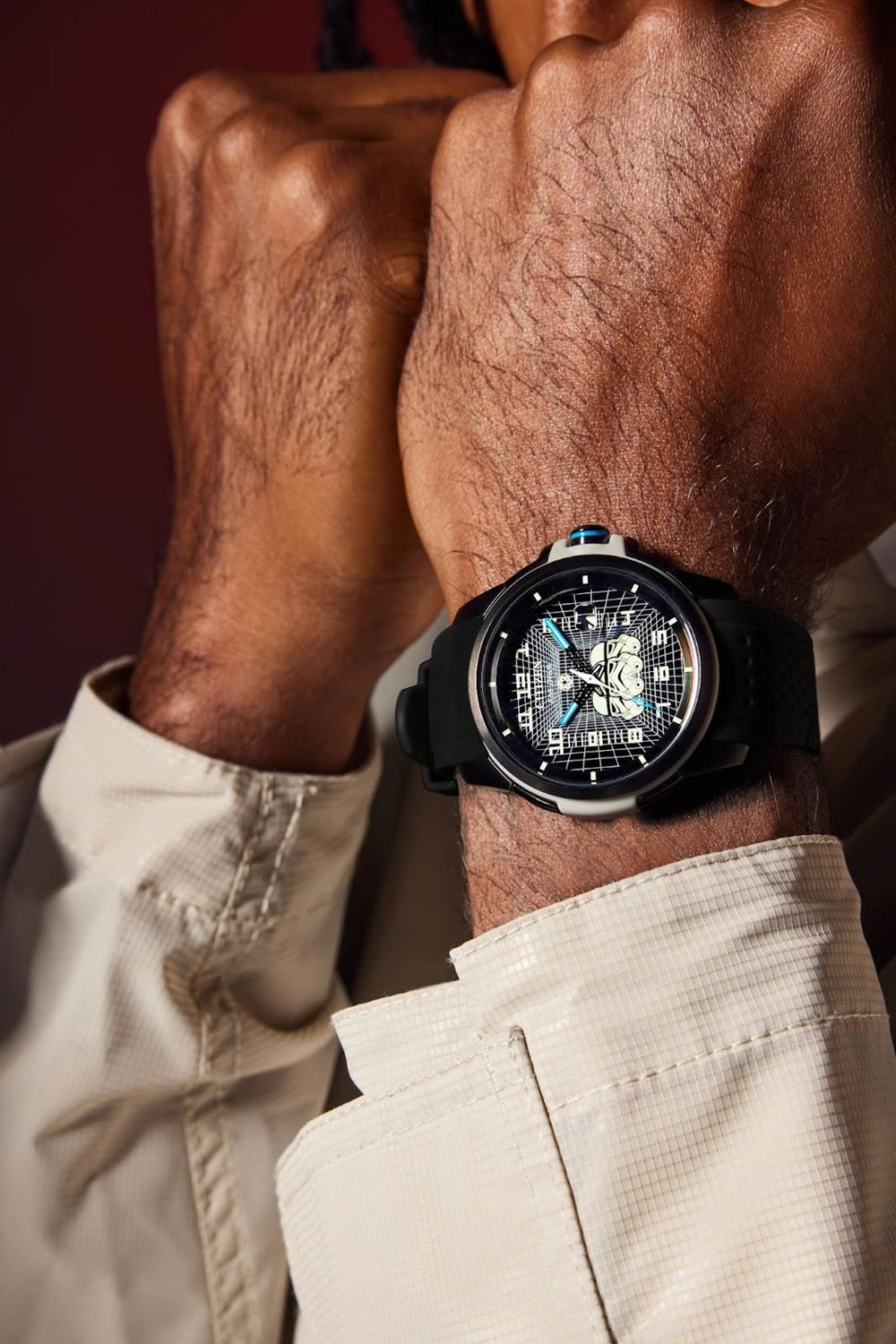 And you can continue your path to the dark side with the Darth Vader watch ($316), a “44mm chronograph in a bold black case, channeling the dark dominance of the Sith Lord with red detailing throughout. An illustration of Darth Vader’s helmet, a TIE fighter, and details from a starfighter’s screen decorate the display's sub-dials, while along the periphery of the dial luminous crimson hour markers harken to the Sith's iconic red lightsaber."