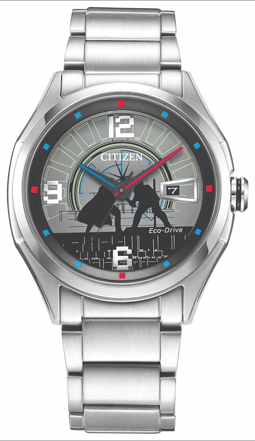 The Duel watch ($280) “showcases one of the most epic lightsaber duels in the Star Wars galaxy on its dial, the struggle between Luke Skywalker and Darth Vader on Cloud City. Featuring a black outlined dial with pops of green and markers in blue and red, this uniquely designed watch face creates a domed effect giving the illusion that it is a 3D image."
