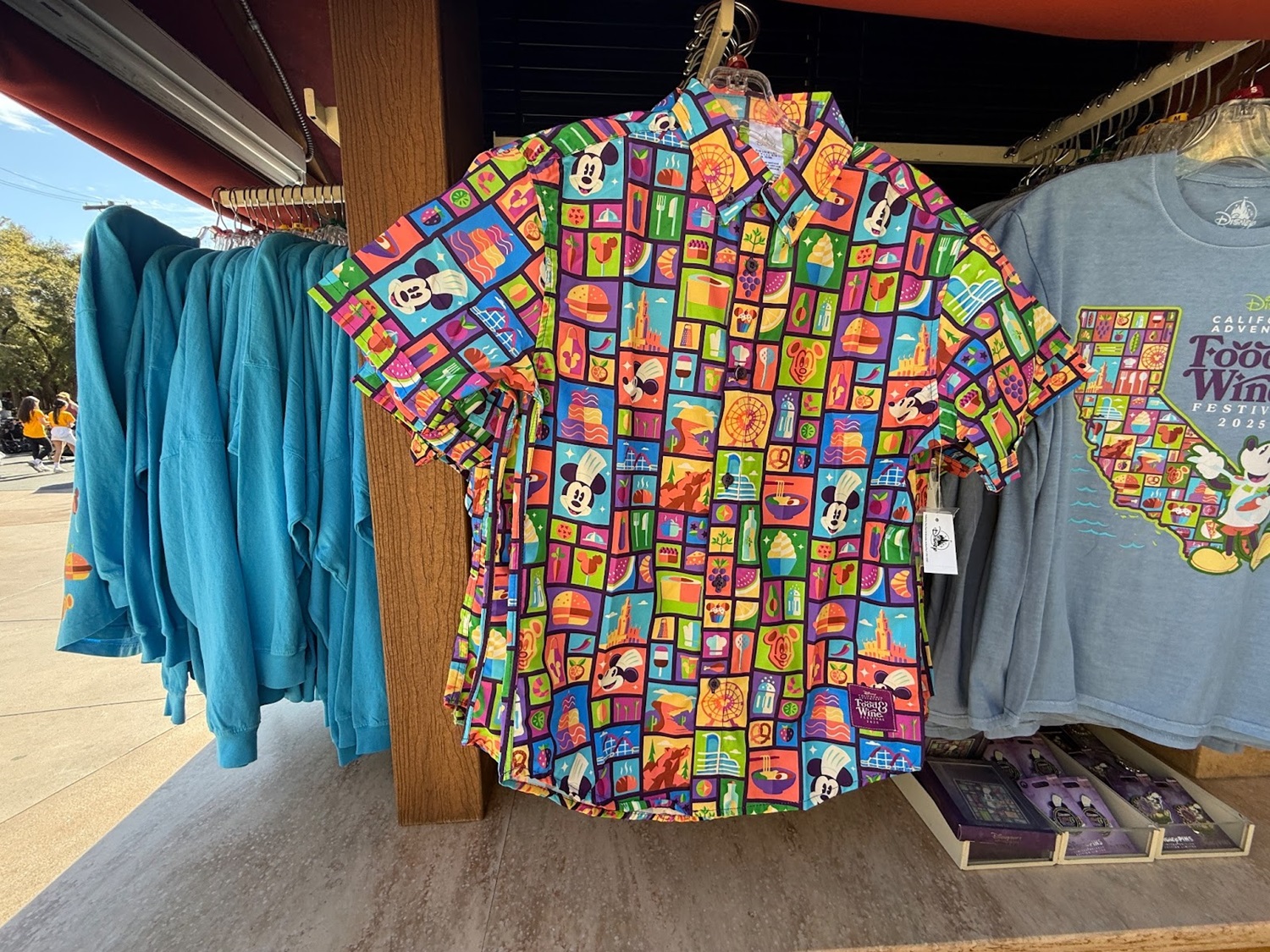 Apparel items include a delightful button-up shirt featuring various icons from Disney California Adventure and the Food & Wine Festival, along with a T-Shirt that also makes use of the same design within the shape of California.