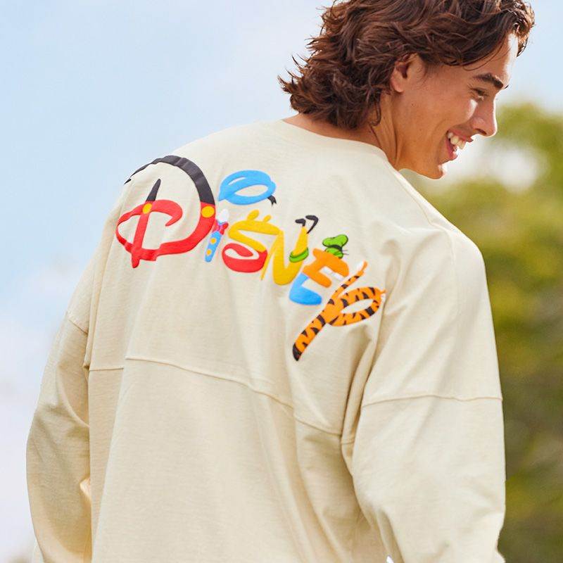 - This new design just dropped at Disney Store and features a cream colored base with bright hues for the large “Disney" displayed across the back shoulders.