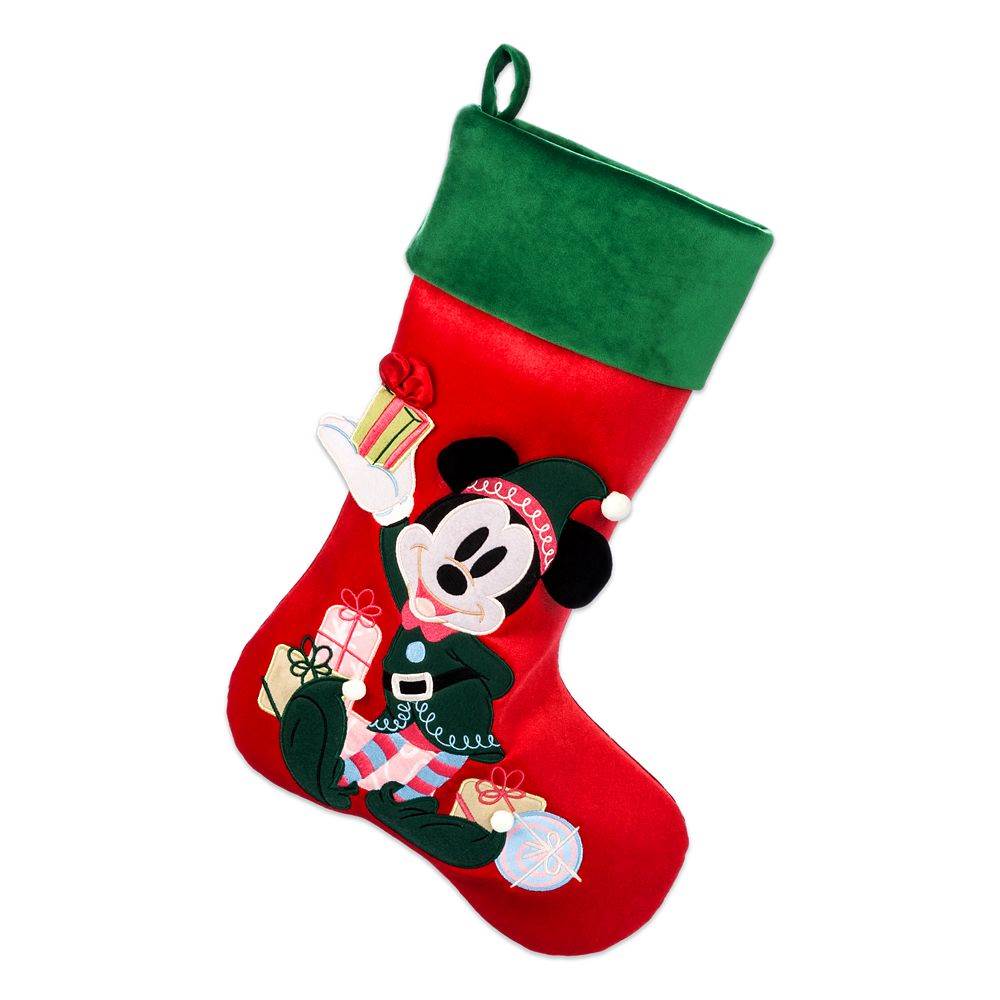 - Mickey’s stocking is holiday red with a green cuff, while Minnie is the exact opposite. Dimensional features include while pom poms along Minnie’s dress, Mickey’s shoes, and their elf hats.