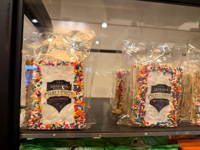 A concessions area sold breakfast, lunch, and snack items, including Disney Lorcana Challenge crispy rice treats.