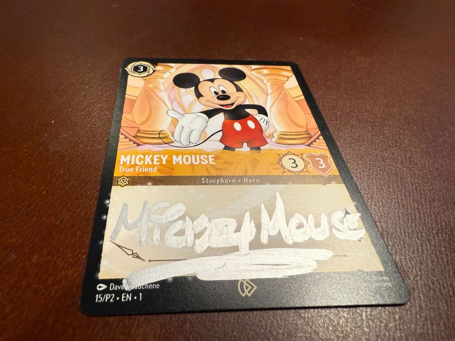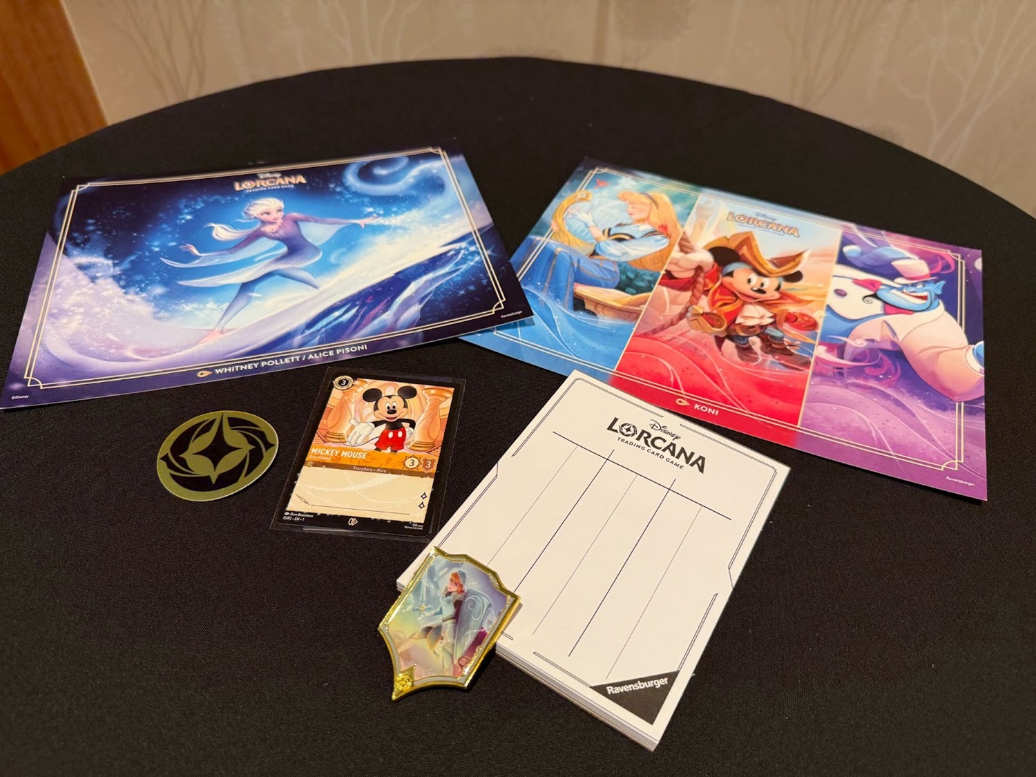 All attendees received a gift bag featuring lithographs by two of the artists who were on hand at the event for meet & greets, Koni and Whitney Pollett (Amber Kommavongsa was also there to meet fans and sign autographs); an event pin featuring the Challenge variant art for Cinderella – Stouthearted; a sticker, score booklet, and a Mickey Mouse – True Friend variant card designed to be autographed.