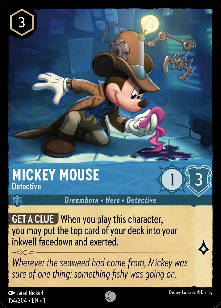 I do want to mention that, like with the Into the Inklands sets, these two starter decks do contain a few previously-released cards alongside new ones. This includes cards from The First Chapter, Rise of the Floodborn, and Into the Inklands. That said, one super clever choice here is bringing Mickey Mouse – Detective back in the Sapphire/Steel set. That’s because this card happens to feature a clue that pointed to Ursula way back then.