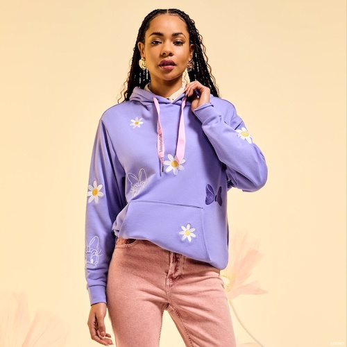 This oversized hoodie is designed with pastel and embroidered details. Look closely and you’ll find her bestie, Minnie, making a surprise appearance!