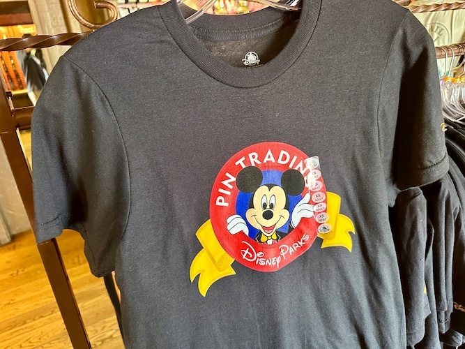 While pins have always been sold at Disney Parks, the modern brand of Disney Pin Trading first began in earnest at EPCOT during the Millenium Celebration in 1999. The next year, it expanded elsewhere throughout Walt Disney World and also to the Disneyland Resort. Now, Disney is celebrating Pin Trading’s 25th anniversary with a fun new collection – which includes this shirt featuring the Pin Trading logo.