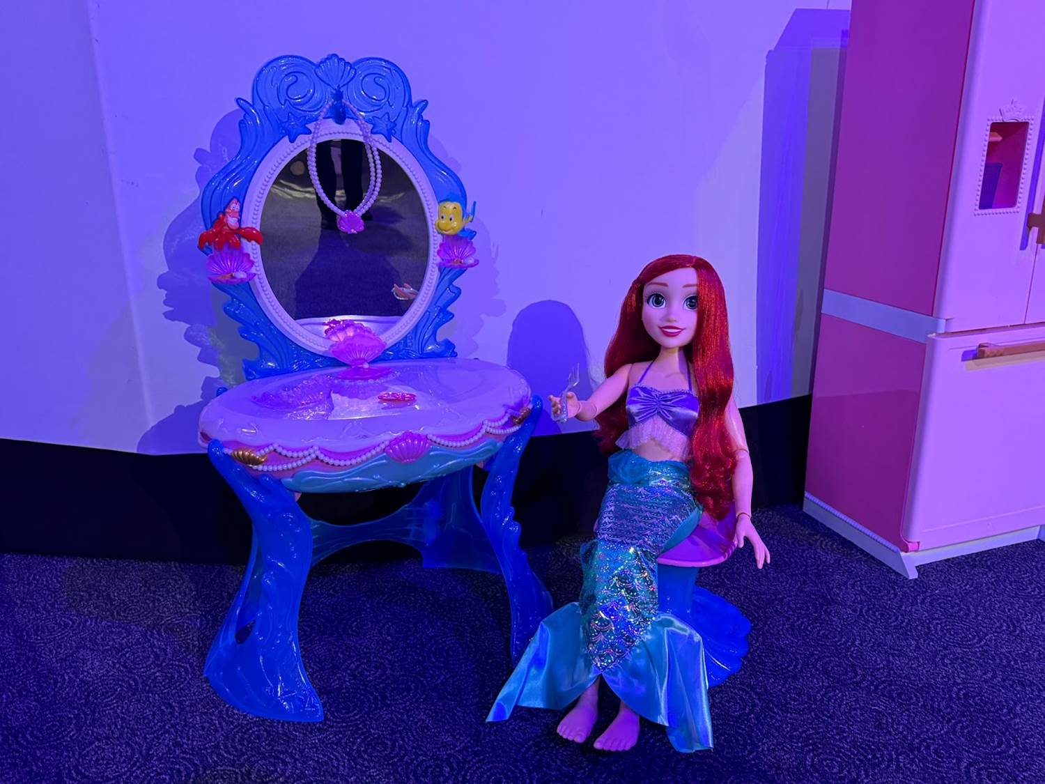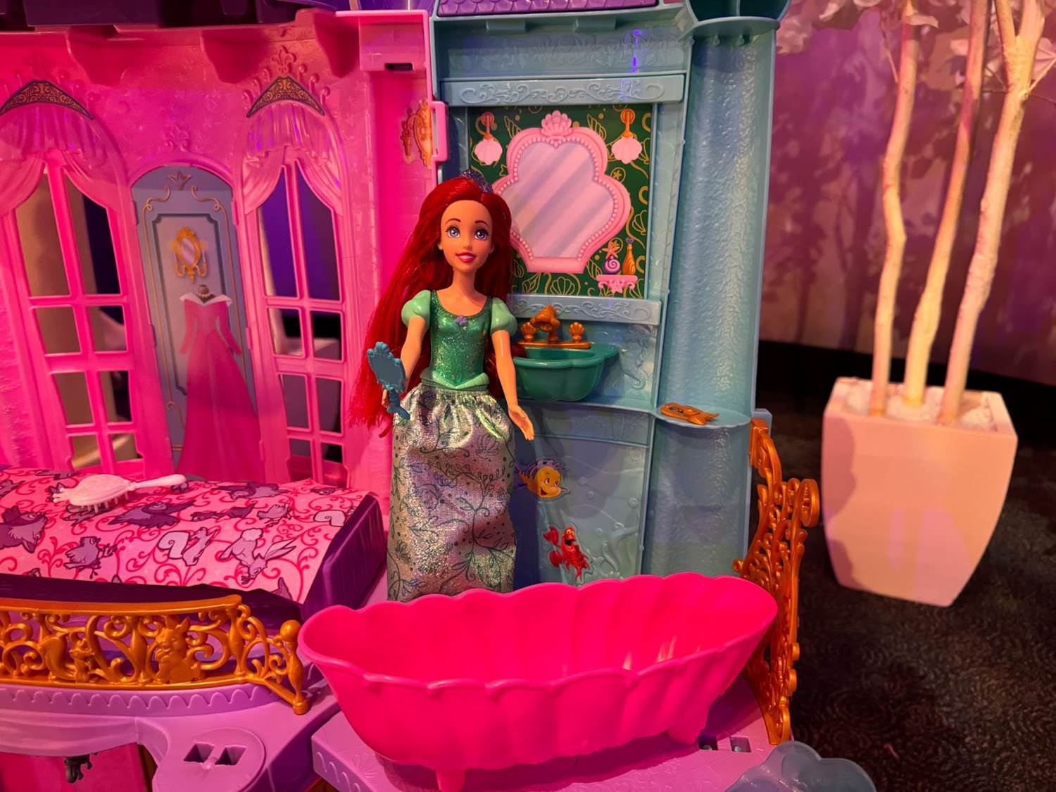 The bathroom is inspired by Ariel, with a waterslide that sends dolls from the second floor down to the first.