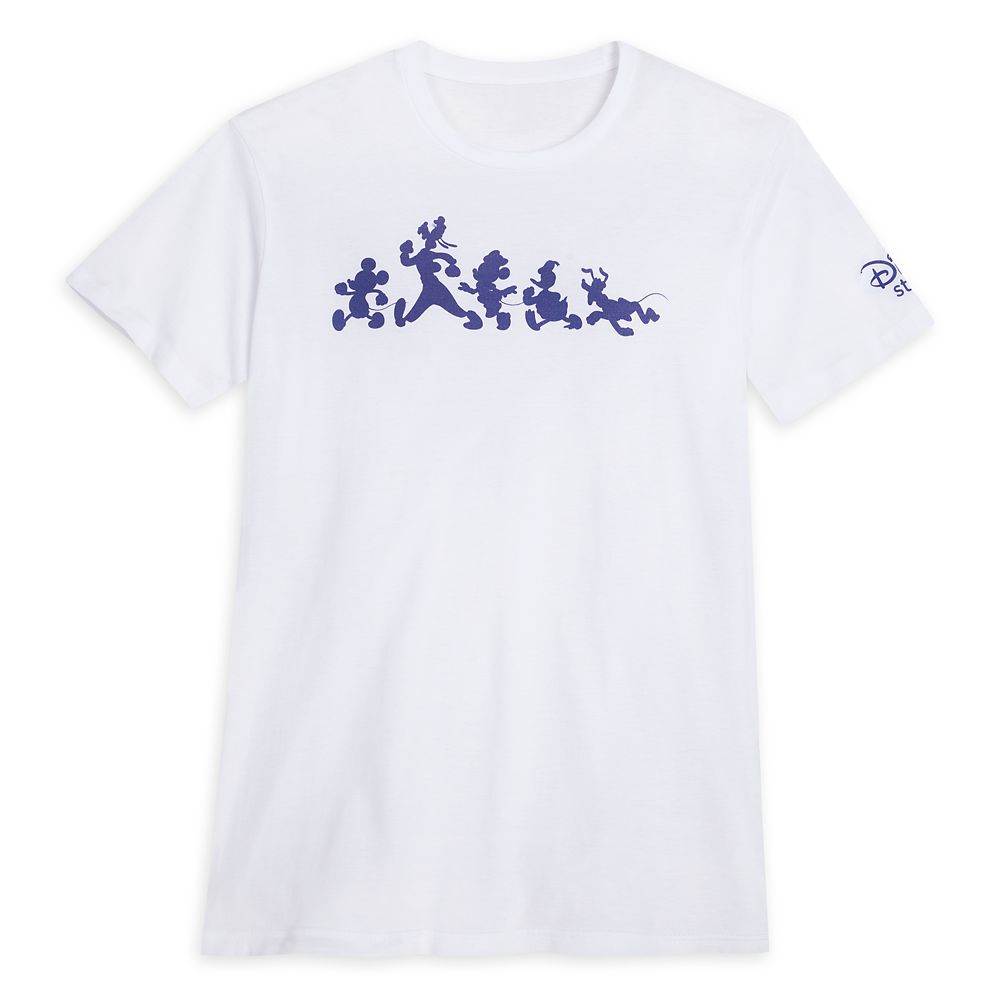 - Most items in the collection are navy blue with white lettering or character silhouettes of Mickey, Minnie, Goofy, Donald, and Pluto. The one exception is short sleeve tee that’s all white with blue character silhouettes running across the front.
