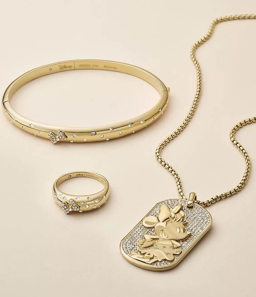- Finally, Disney | Fossil also features special-edition jewelry, shining with hand-placed pavé crystals and crafted in stainless steel with black- or gold-plating.