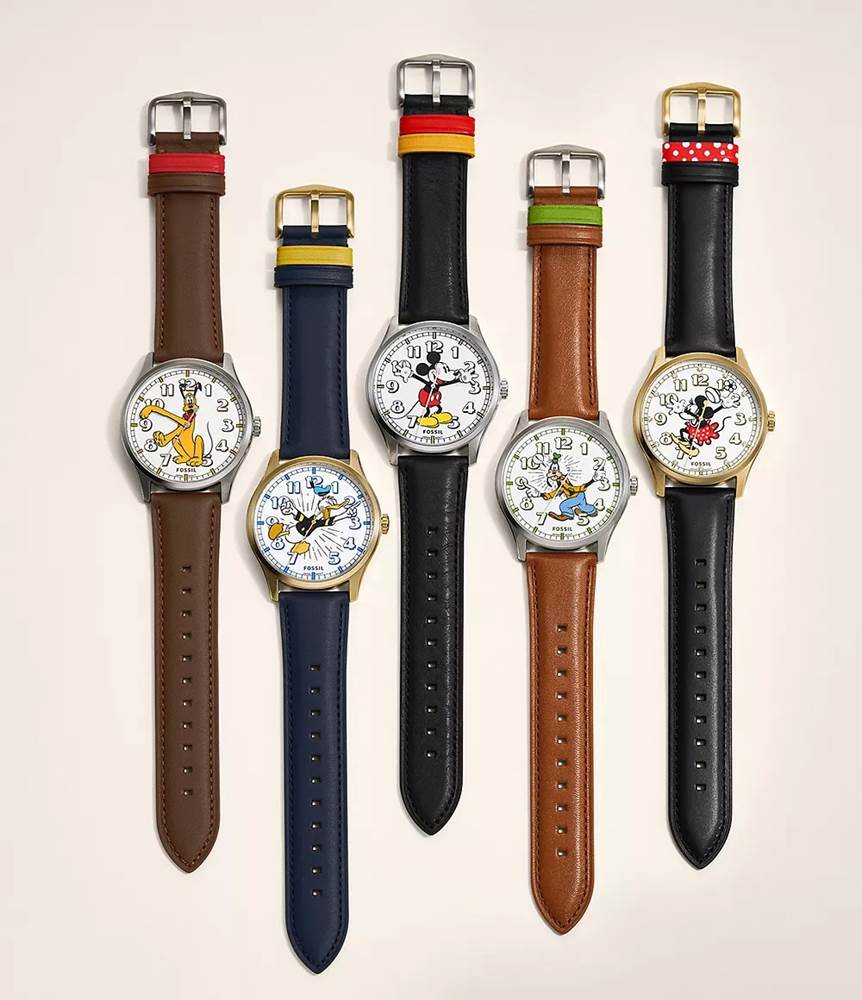 - In addition to the special- and limited-edition watches, Disney | Fossil also offers five timepieces designed exclusively for Fossil Outlet featuring Mickey Mouse, Minnie Mouse, Pluto and more.