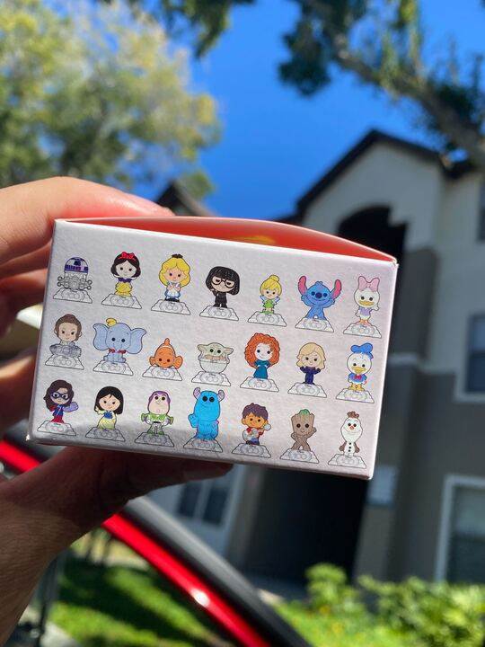 - These toys have white round bases with a character figure on top.