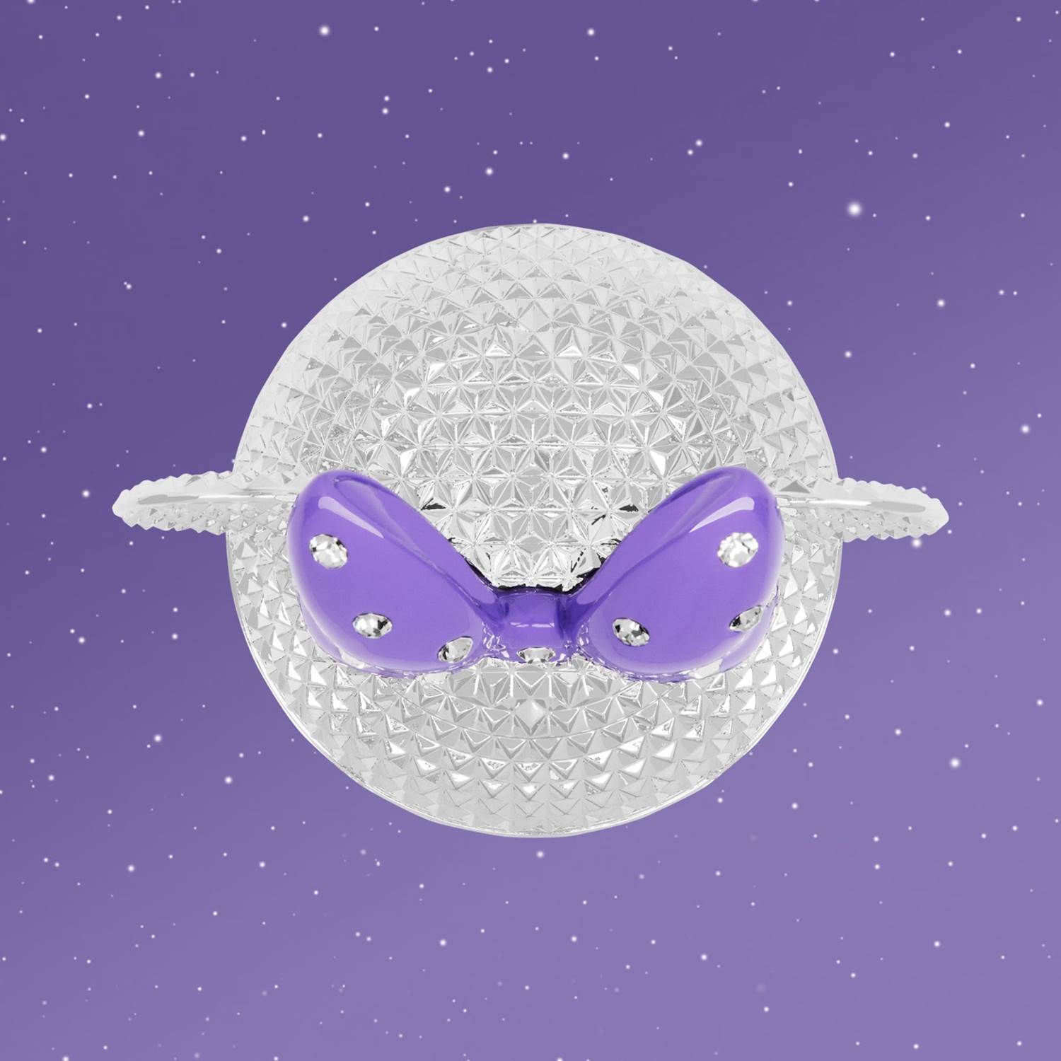 - Keeping with the color scheme of the yearlong celebration, this special release features a beautiful purple glass vessel that’s topped off with a fun silver geodesic cap that looks like EPCOT! To complete the look a hand-painted three dimensional purple bow sits atop the sphere and is embellished with Swarovski crystals.