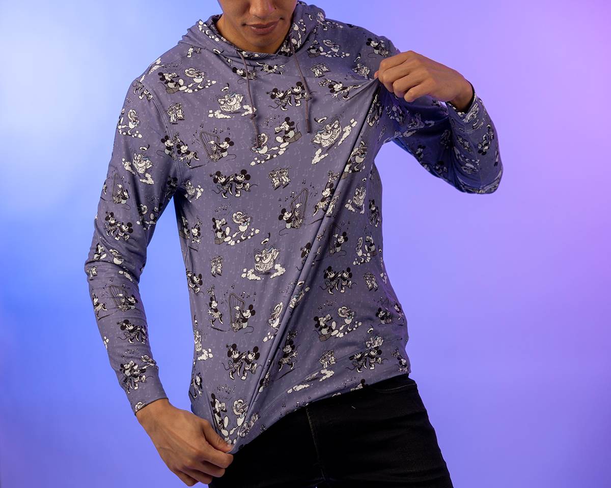 The star piece in this drop is the Limited Edition “Steamboat Mickey" Reversible Bomber Jacket ($85). The unisex cut and dual sided designs make it a versatile item for Disney fans and is a great outer layer for those chilly fall days. One side features the black and white “Steamboat Mickey" pattern accented with solid black sleeves, collar and hem. The reverse is an off white background featuring a small Steamboat Willie logo on the chest while the back boasts a large image of Mickey and the steamboat among the words “Disney Cartoons Presents" and “Steamboat Willie." The black collar stays, but the sleeves are now greyscale like an old fashioned cartoon!