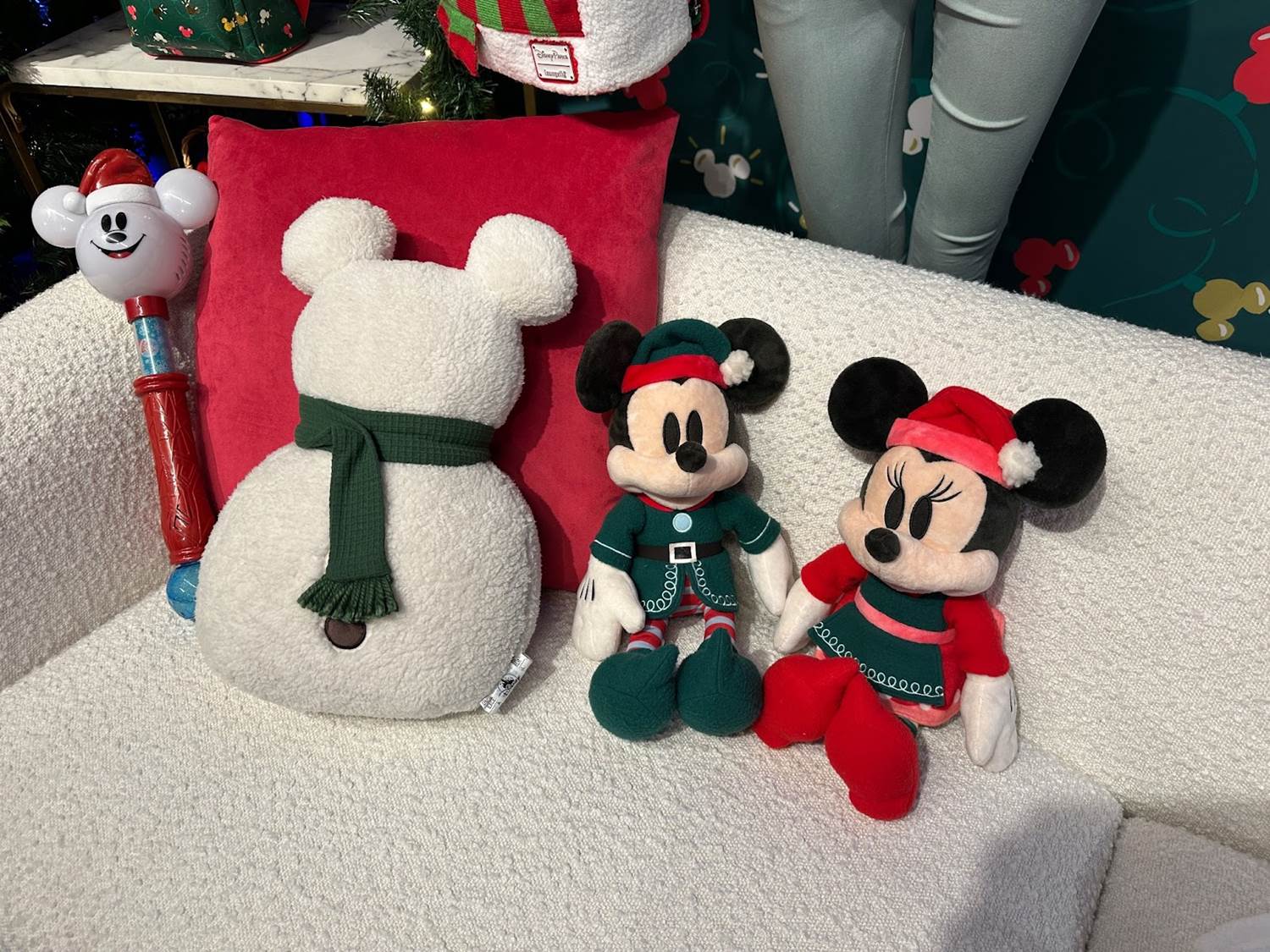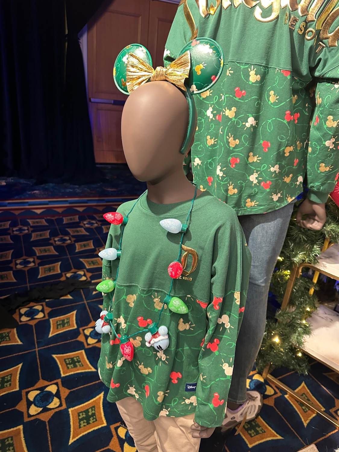 Most of the items on display are from the Mickey Mouse Family Christmas collection, which features designs decked with green, red, and gold. The line features clothing and accessories for the whole family, including Spirit Jerseys, Minnie Ears, and a Loungfly backpack.