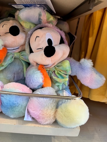 Mickey and Minnie are dressed up as bunnies in these adorable plush. Mickey holds a carrot, while Minnie holds a chocolate bunny.
