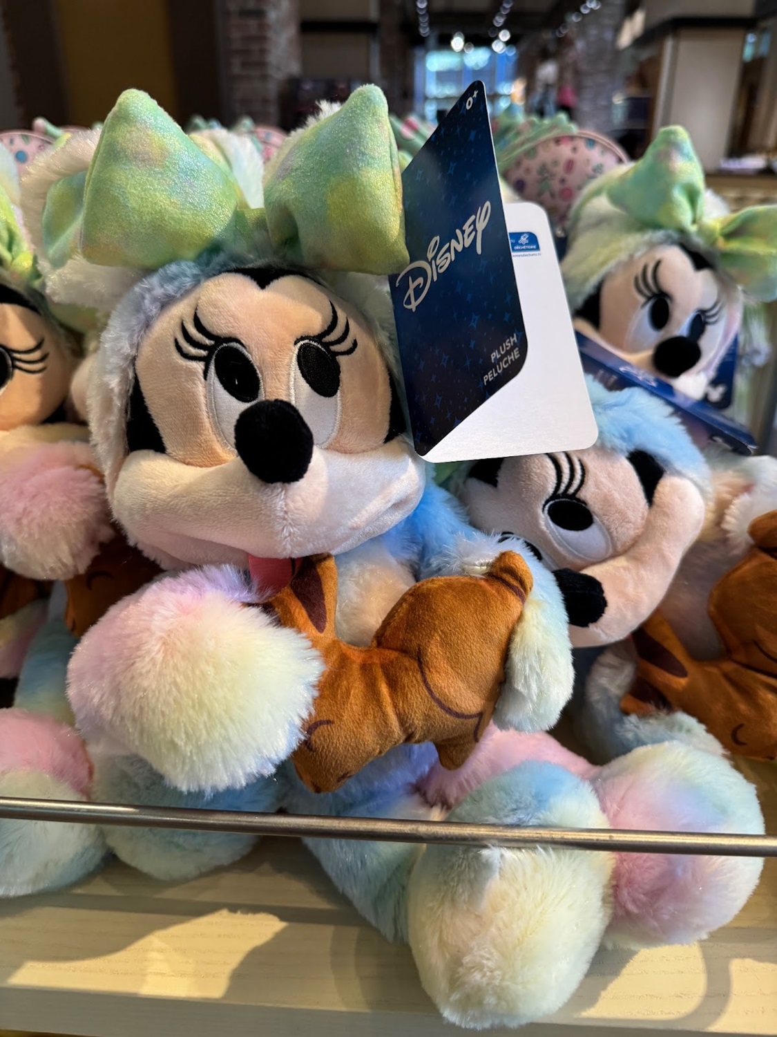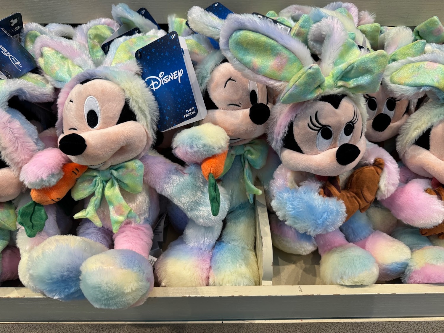 Mickey and Minnie are dressed up as bunnies in these adorable plush. Mickey holds a carrot, while Minnie holds a chocolate bunny.