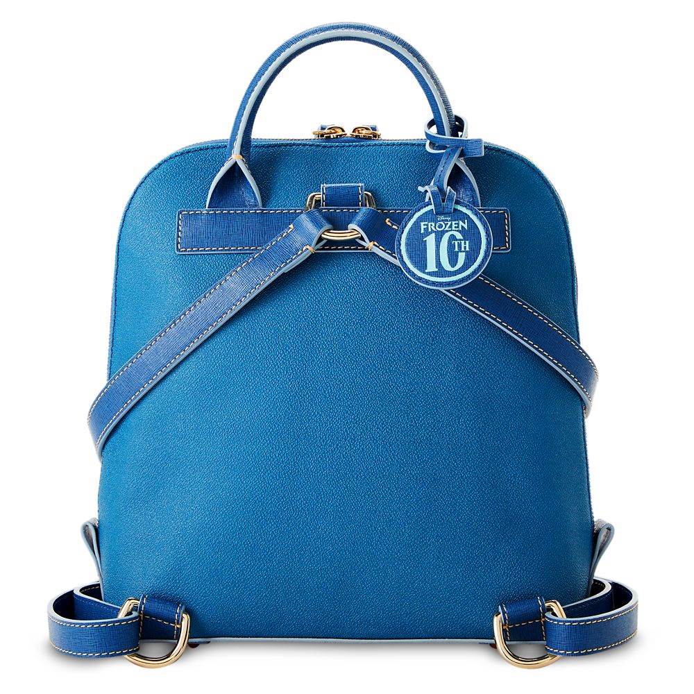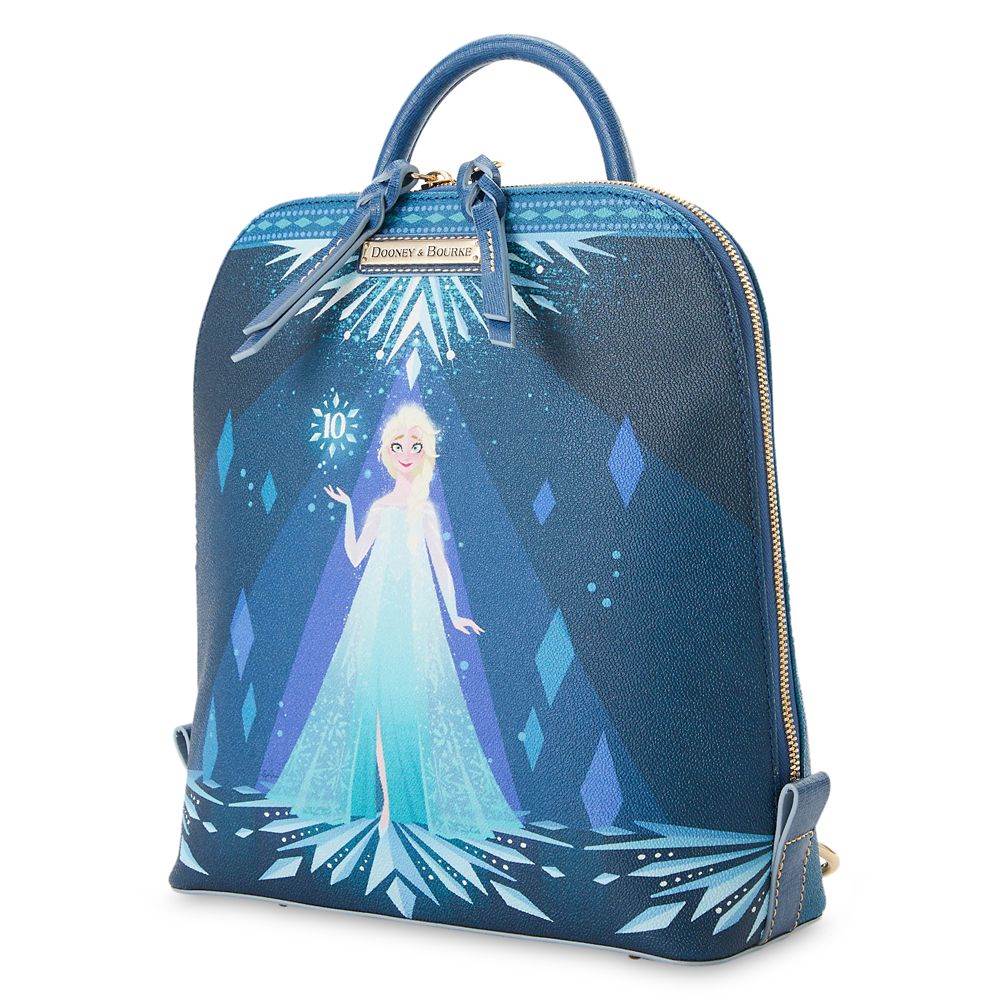- But that’s hardly it for Queen Elsa! She’s featured solo in her ice palace gown on the front of the backpack with a stylized “10" floating above her right hand to indicate the anniversary year. Additionally the backpack and tote come with a removable Frozen 10th Anniversary leather tag.