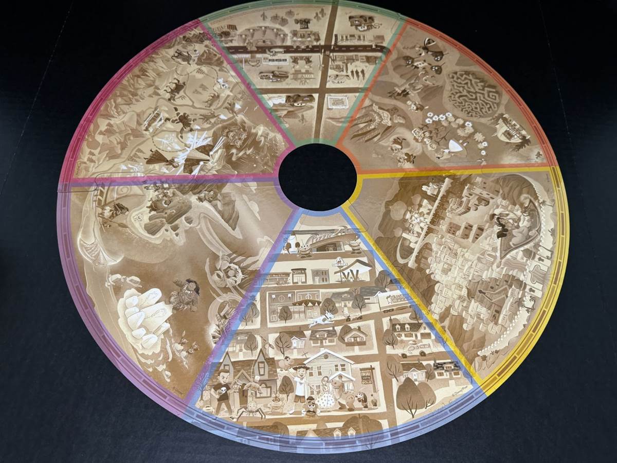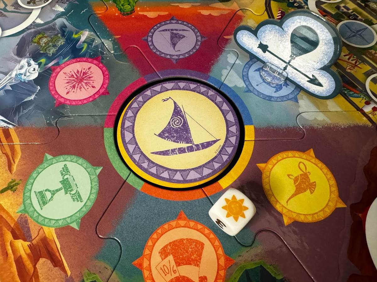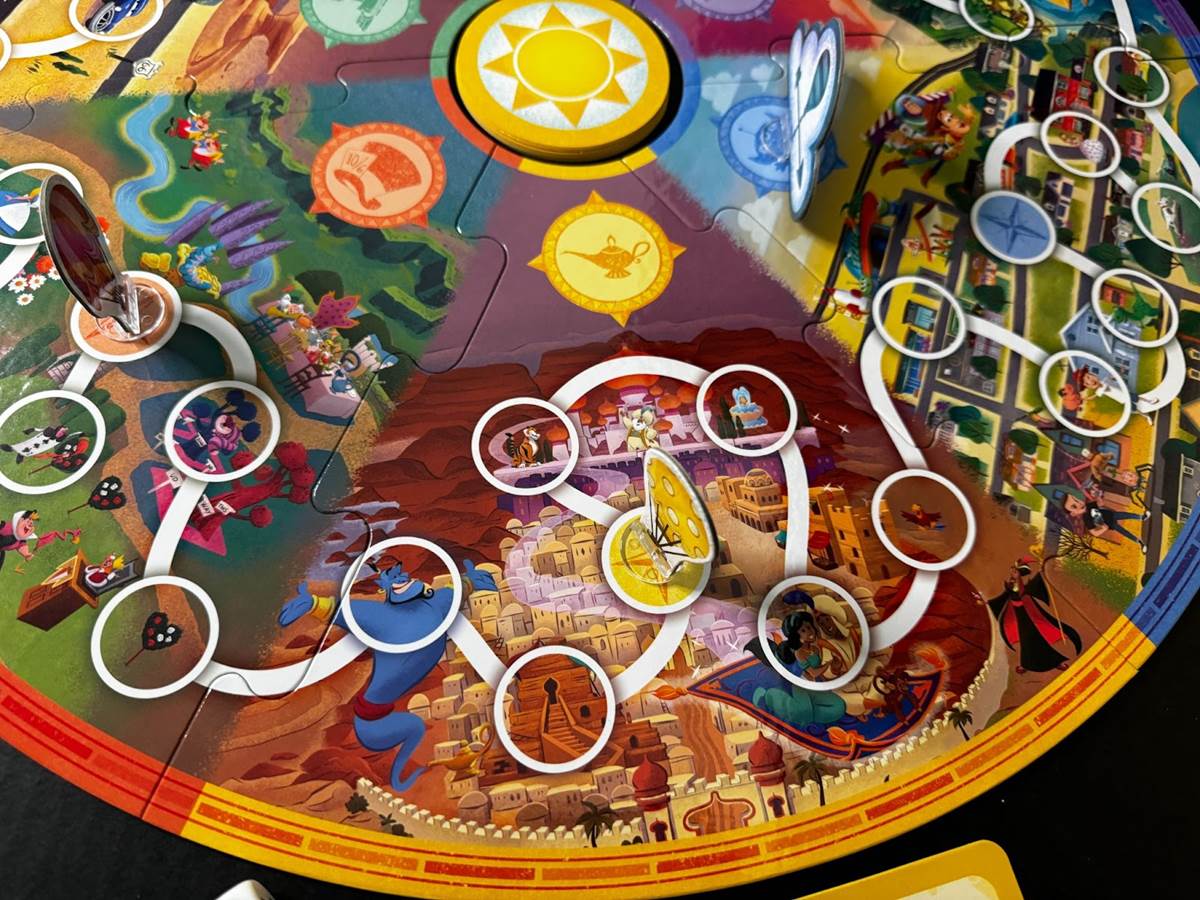Speaking of the regions, the artwork on Disney Around the World is very appealing, and Disney fans will love examining each slice closely. The board also assembles like a puzzle, with each slice representing its own piece. Take a clooser look at the worlds of Aladdin…