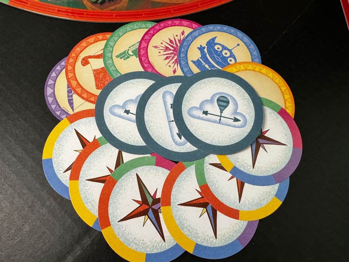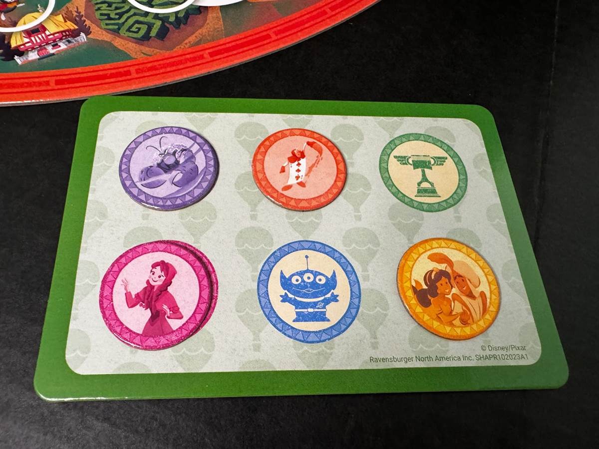Each player is given a hot air balloon (red, yellow, green, or blue) as their pawn, using it to navigate through lands inspired by Disney’s Aladdin, Alice in Wonderland, Frozen, and Moana, plus Pixar’s Cars and Toy Story. Your hot air balloon comes with a passport and the goal is to be the first to collect a stamp from four regions.