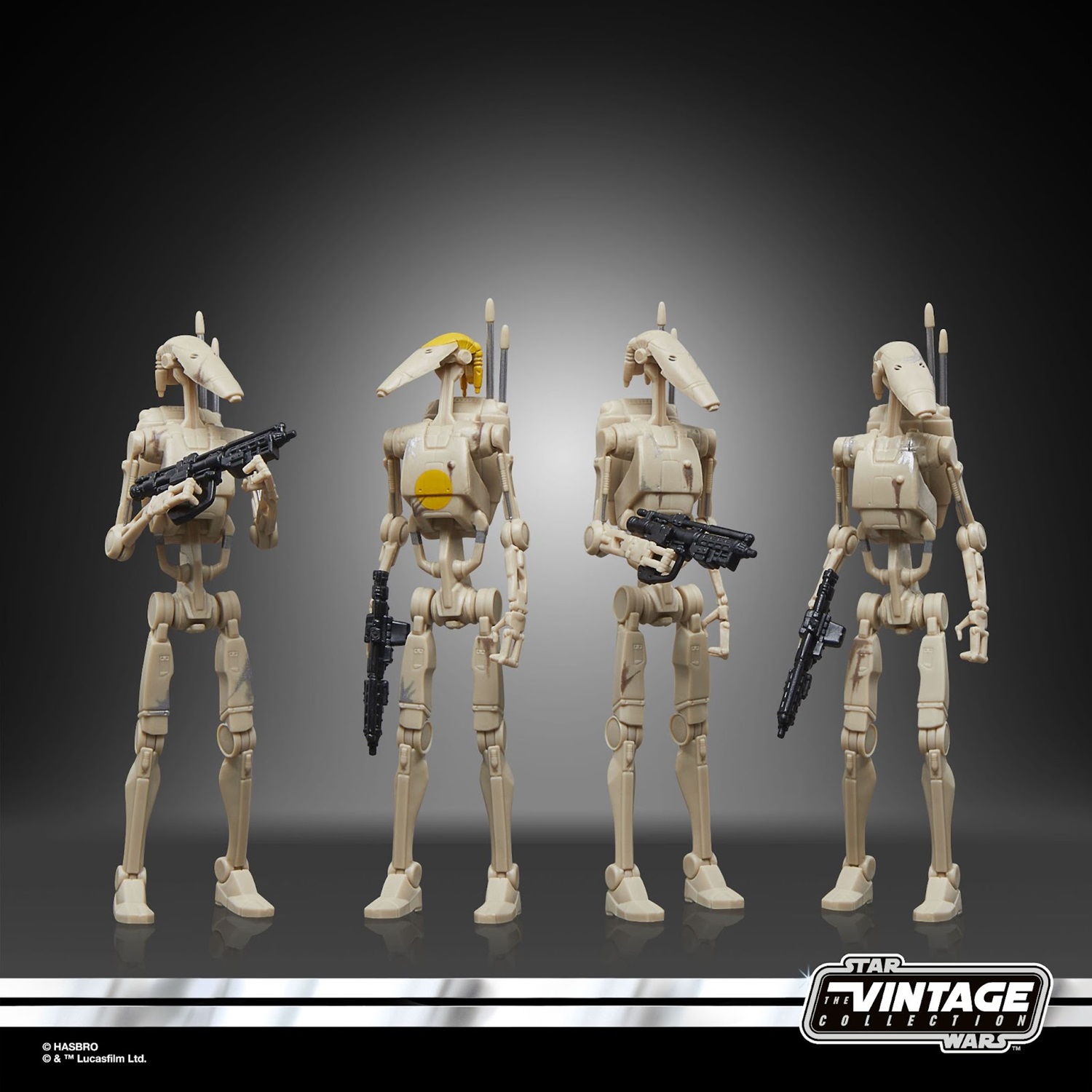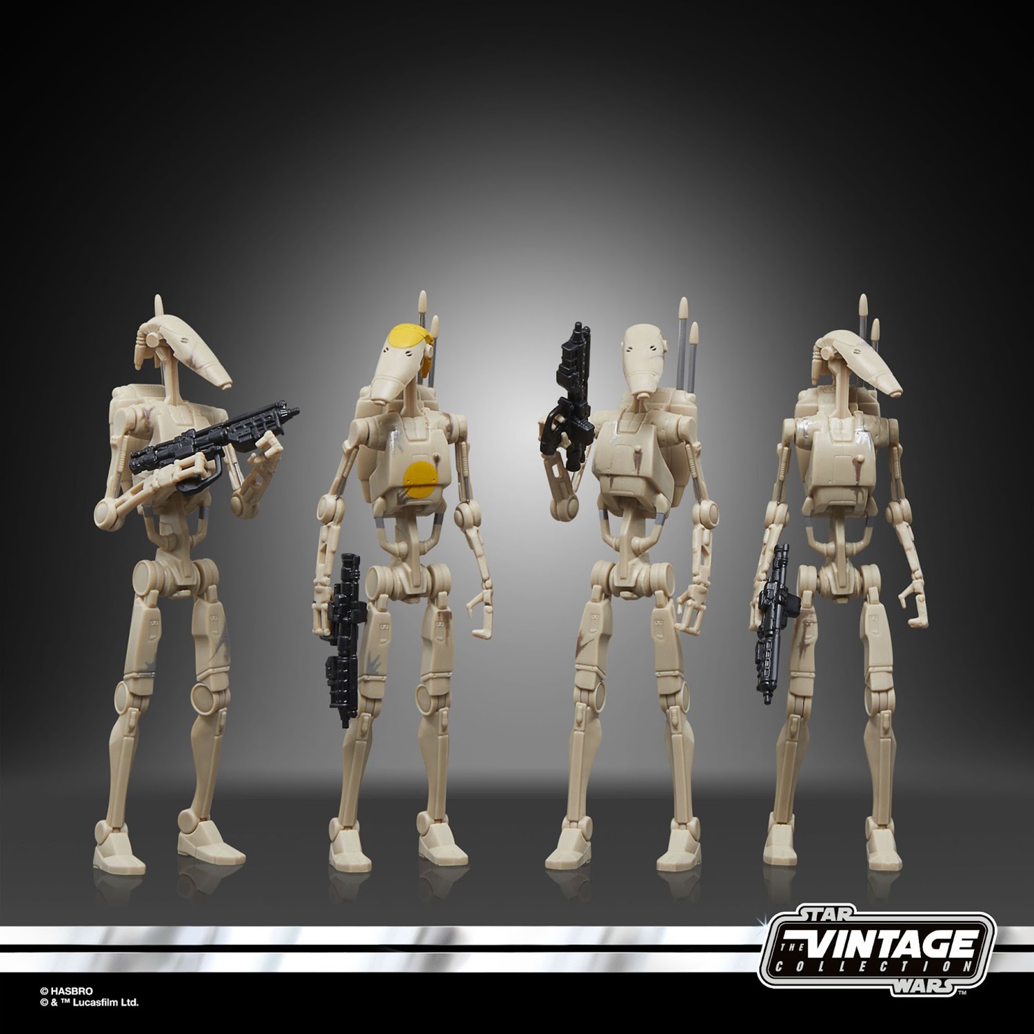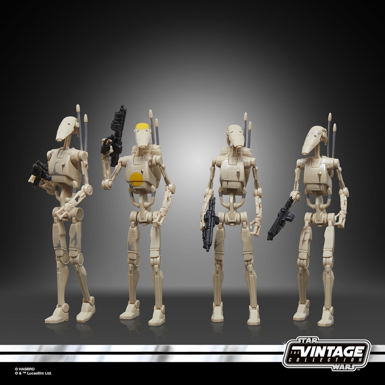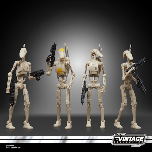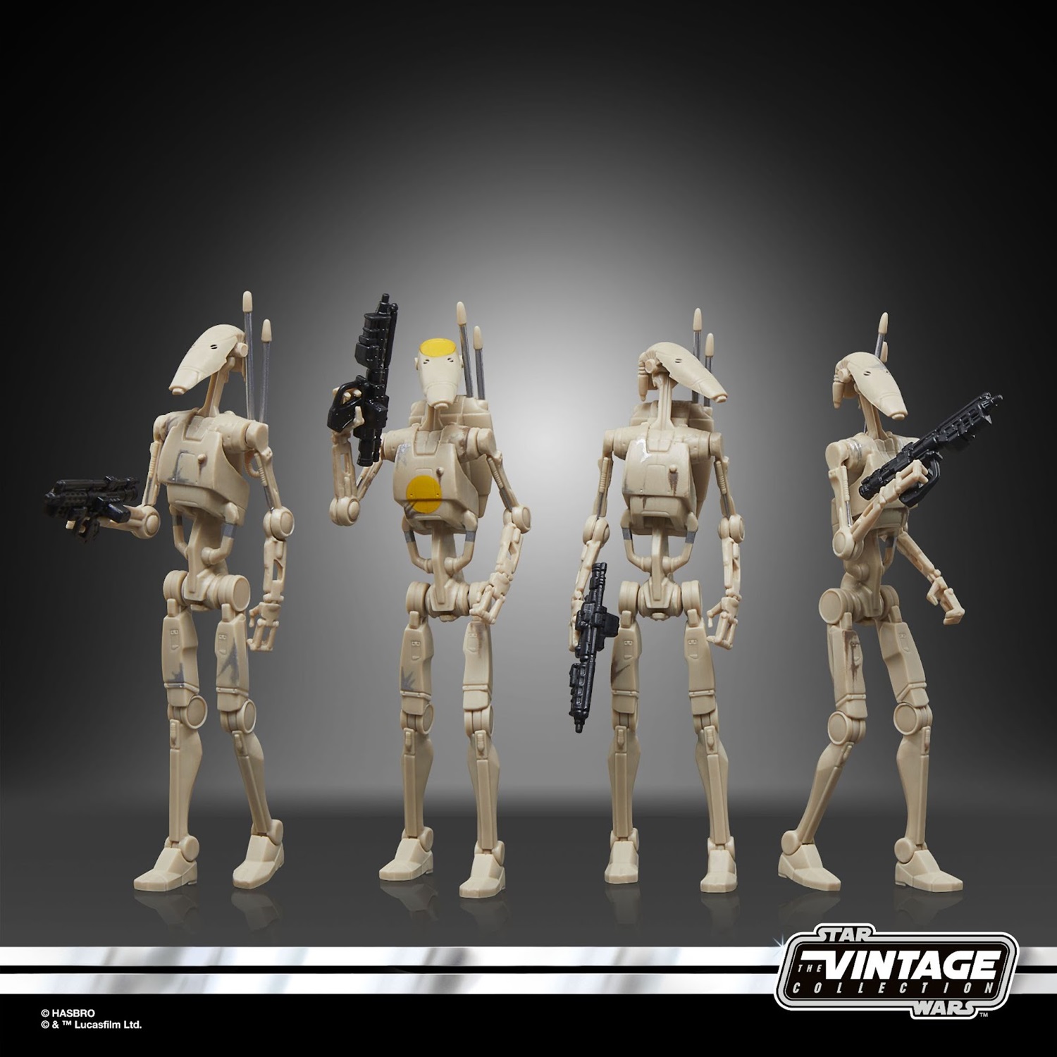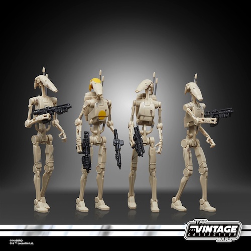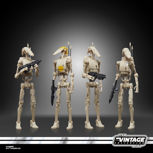 Star Wars: The Vintage Collection Battle Droid 4-Pack ($54.99) - “The soulless ranks of Separatist armies are dominated by tall, thin B1 battle droids built as mechanical imitations of their Geonosian designers. Based on battle droids from STAR WARS: THE PHANTOM MENACE, this 3.75-inch-scale figure makes a great addition to any fan’s collection. Features movie-accurate deco and multiple points of articulation. This troop-building pack comes with removable backpacks, droid antennas, and blaster rifles for each figure. Display your fandom on your shelf with the unique character art on the closed box outer package with Kenner branding."