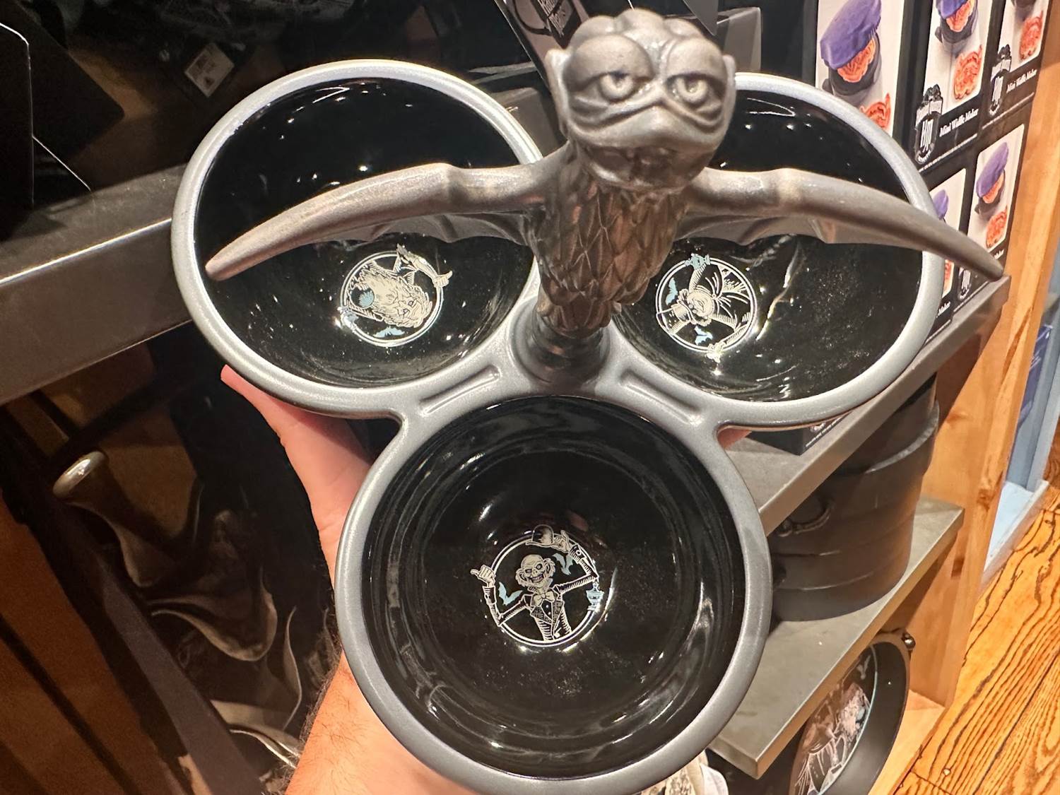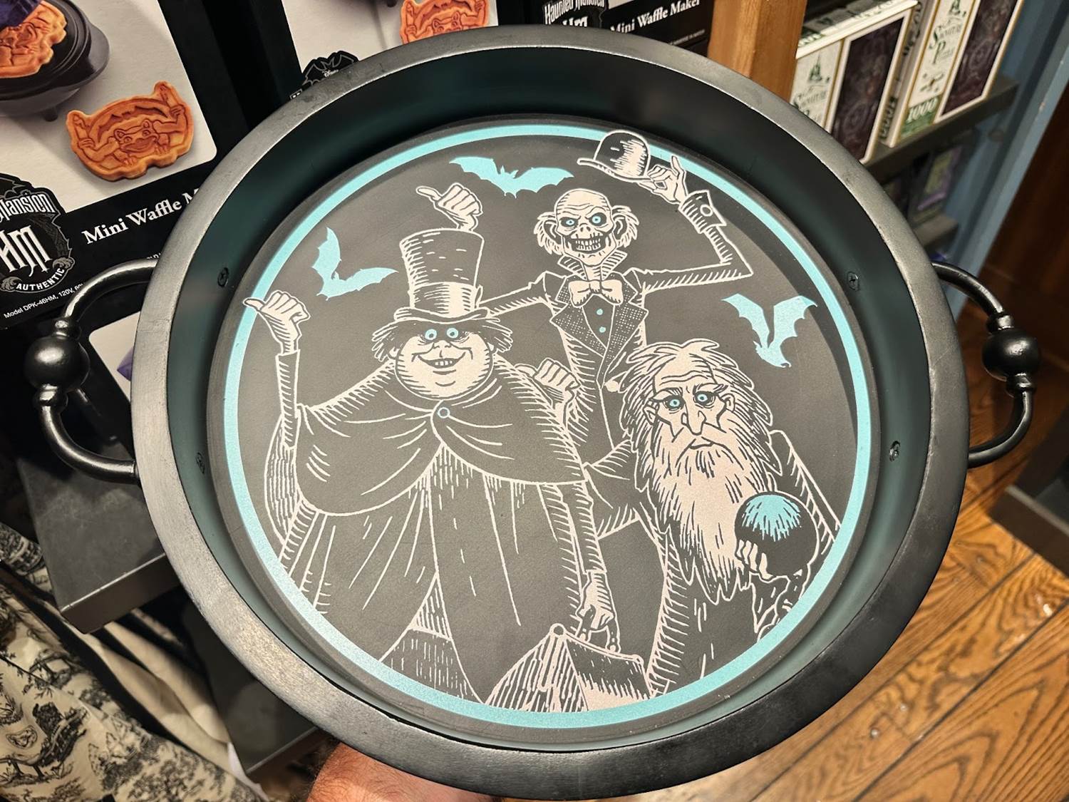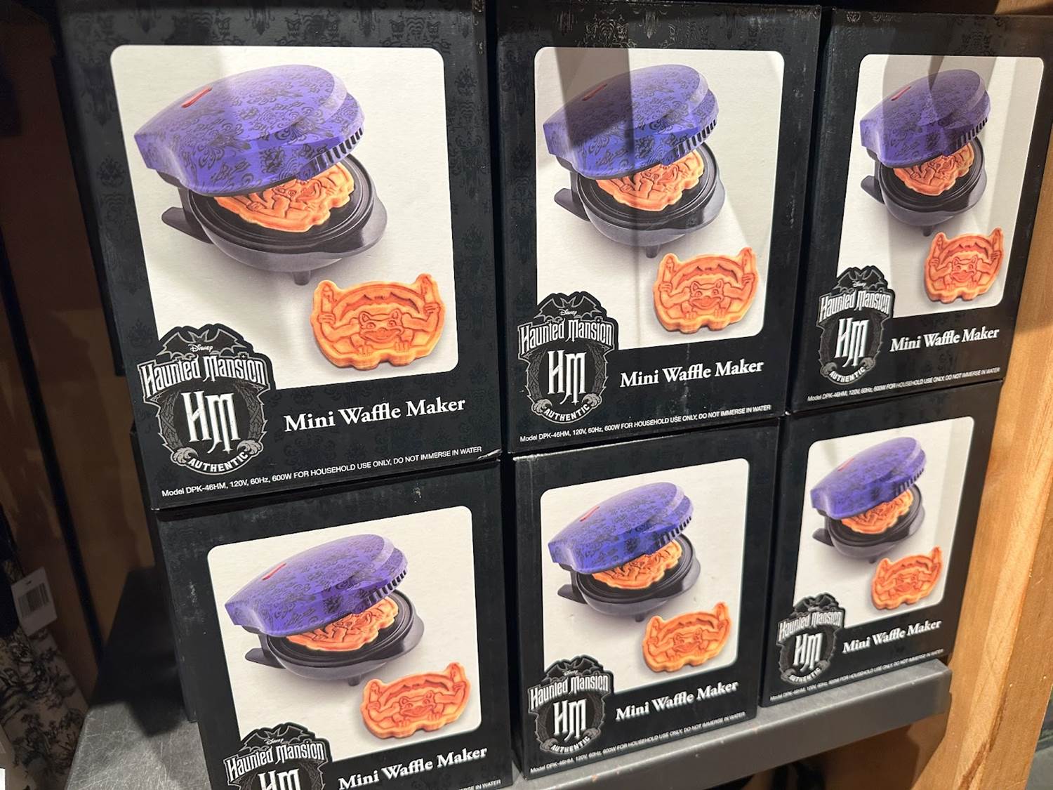 The Haunted Mansion is no stranger to merchandise collections, and a new one has just dropped, featuring a number of home goods items – from plates and bowls, to even a waffle maker! Many of these items feature the iconic gargoyle lights that lurch over guests in the stretching room. We spotted these items at the main Haunted Mansion gift shop in the Magic Kingdom, Memento Mori.
