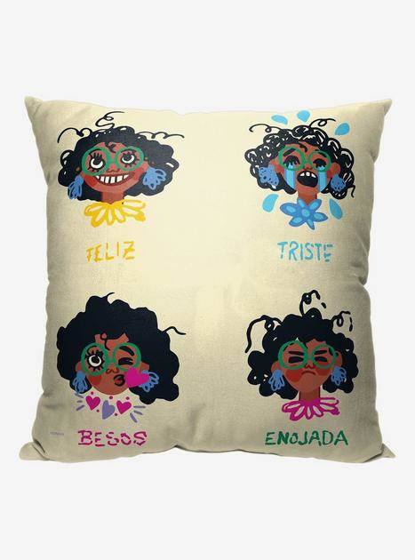 If Lusia’s strength is something that speaks to you, she’s also featured on a throw pillow that will perfectly accent your couch, bed or favorite chair; and Mirabel’s pillow shows the teenager expressing a variety of emotions (written in Spanish) such as happy, sad, kisses and annoyed.