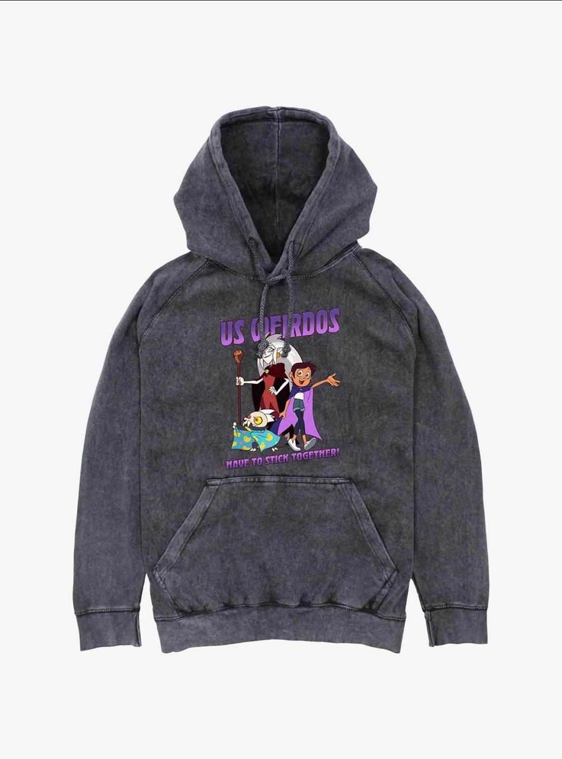Sure The Owl House has ended, but you can still rep the show and your favorite characters on a daily basis with stylish selections from Hot Topic. There’s nothing more classic than a top with a show's logo; this simple black and gold hoodie covers all the bases. Then for all you weirdos out there Luz, Eda, King and Hooty pause for a moment to pose on the mineral wash hoodie.