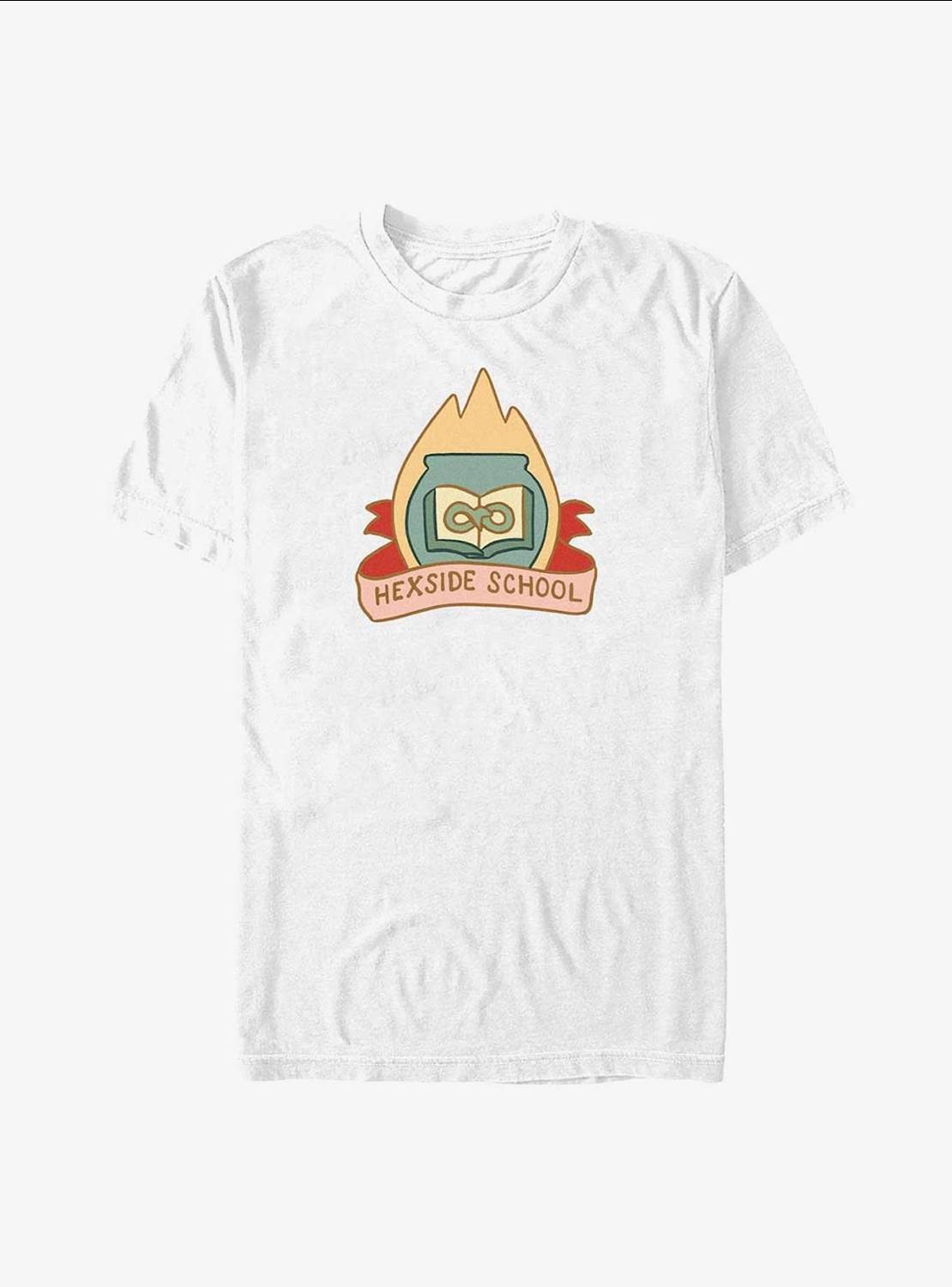 Wrapping things up are a few more T-shirt designs we love starting with a wanted poster for Eda the “Owl Lady" offering a $1 trillion reward! A tie-dye top features Luz and Amity dancing together at the Enchanted Grom; Hooty fills up a tee with his entire owlish face; and Hexside School is featured with their logo of a spell book, cauldron and flame that’s pure magic!