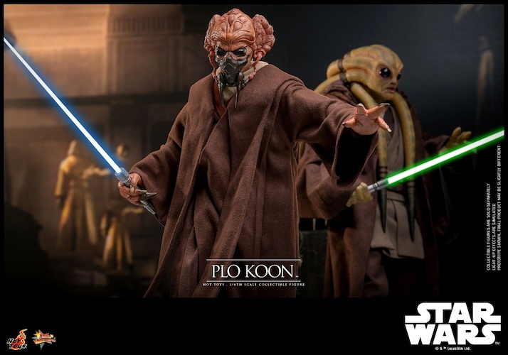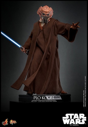 - “The Plo Koon 1/6 Scale Collectible Figure is highly poseable with over 30 points of articulation and comes with an assortment of hands, allowing for a variety of dynamic display options. His layered outfit is expertly tailored and includes a brown Jedi robe with embedded wire, a belted robe with embedded wire, a tunic, pants, and boots. Ready for battle, this formidable Kel Dor comes equipped with an LED light-up lightsaber hilt, a lightsaber hilt with detachable blade, and a blue blade-in-motion effect."