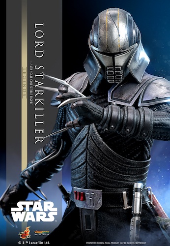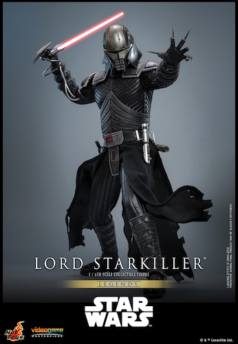 - Sideshow Collectibles: “The highly detailed Lord Starkiller 1/6 Scale Figure features 30 points of articulation and sports a finely crafted battle-damaged helmet with back braid. The dark apprentice wears an intricate, tailored costume with metallic silver-color shoulder and back armor, accordion forearm gauntlets, a black belt with apron, and 4 non-detachable lightsaber hilts. Accessories include an LED light-up lightsaber powered by USB, two hilts with detachable blades, plus blade-in-motion effects."