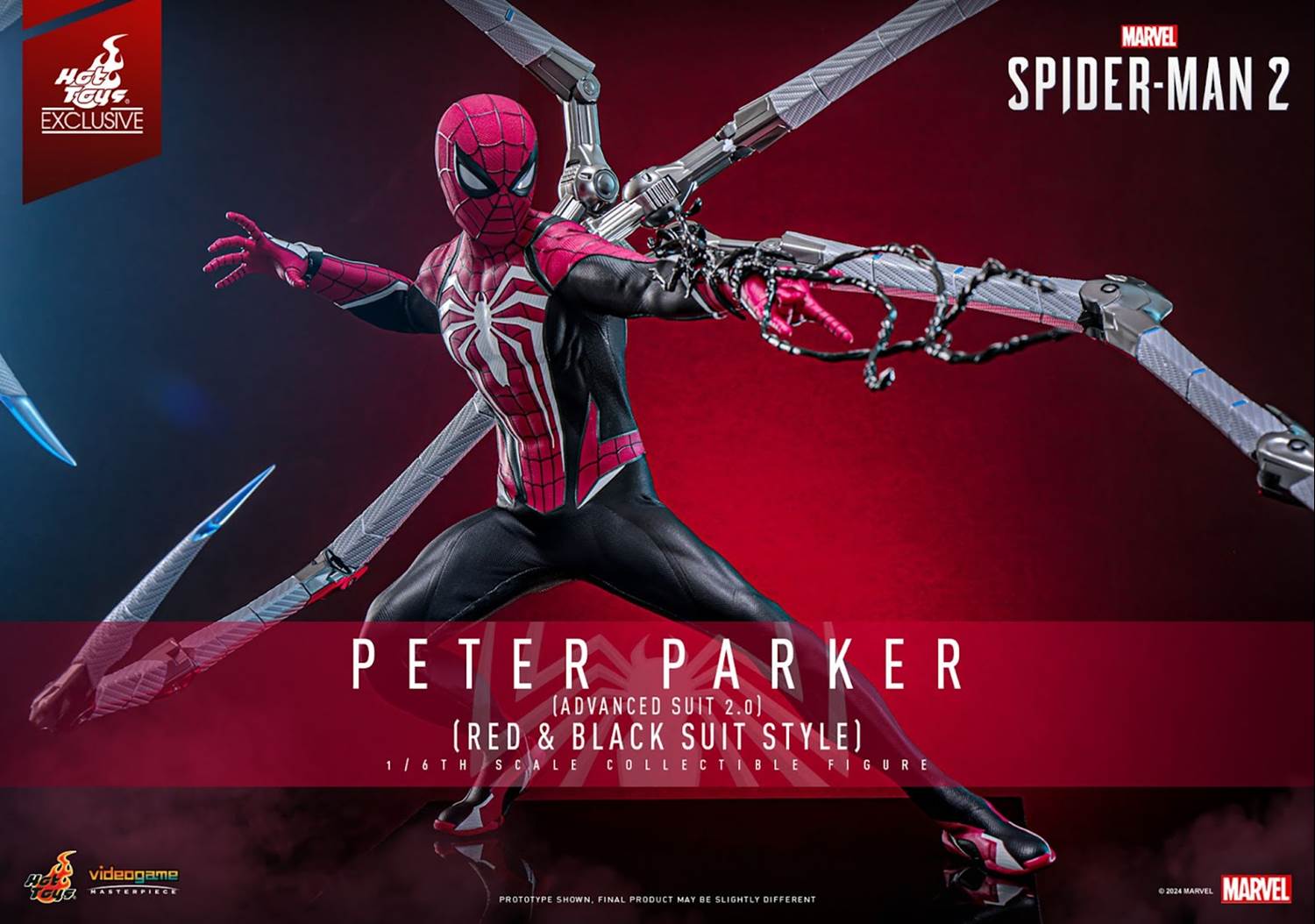 - Sideshow Collectibles: “The Peter Parker (Red and Black Advanced Suit 2.0) 1/6 Scale Figure by Hot Toys wears a tailored suit in a striking red and black colorway with white accents and spider emblem. The figure features a masked headsculpt with 2 pairs of interchangeable eyes for a range of expressions. This figure is highly poseable with over 30 points of articulation, allowing for dynamic display options."