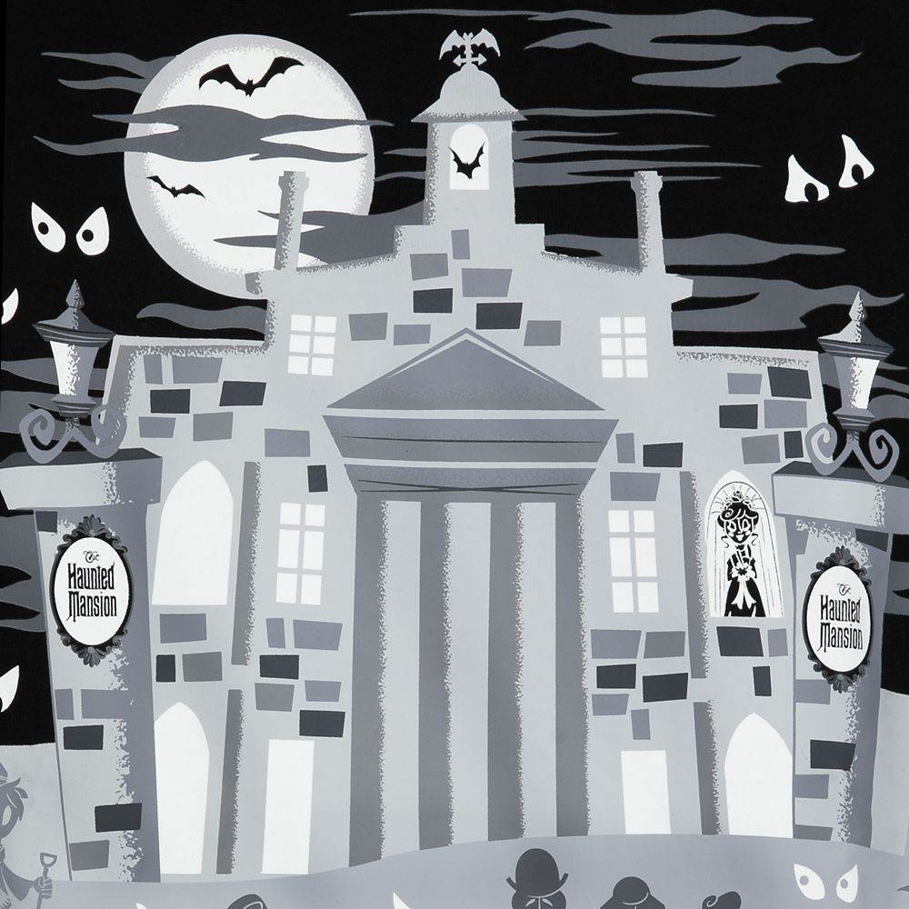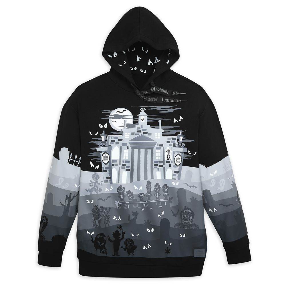 - The greyscale hoodie is covered in a frightful scene of the mansion at night. Mysterious eyes blink out a you (and glow) from every corner, while the graveyard comes to life with sining busts, opera stars, a dearly depart gavekeeper and a fair share of ghosts too.
