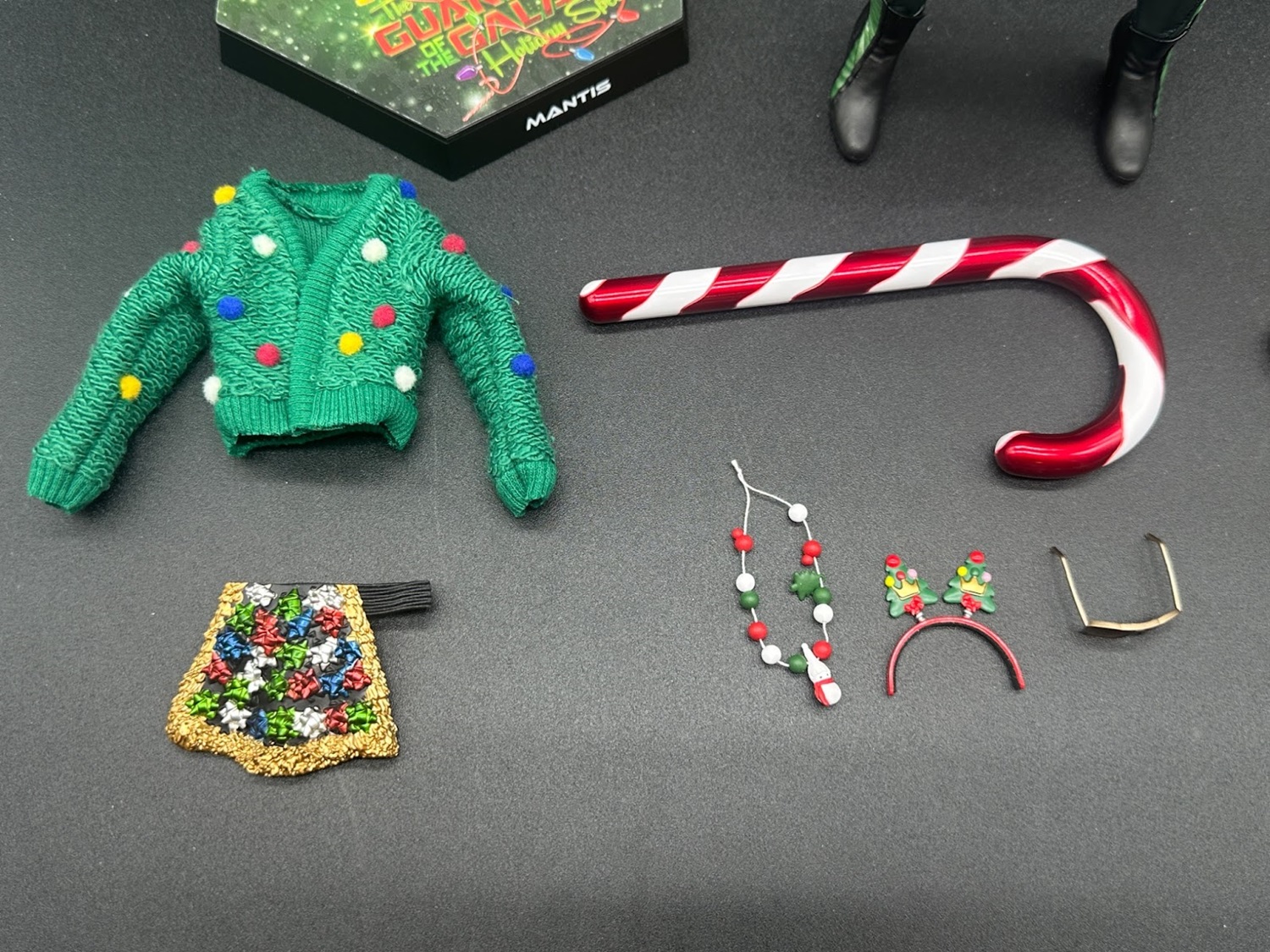 Because again, this is the Mantis from The Guardians of the Galaxy Holiday Special. And while she wore her traditional costume in that special, she also gained some Christmas-themed additions as the story progressed, which is what she comes with here. You can gear Mantis up in her holiday best if you wish, including a sweater, a headband, a skirt, and a necklace, all of which make for a very fun variation on the figure’s normal look.