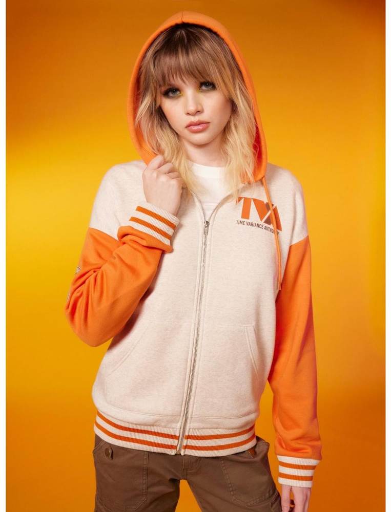 “Hey y'all! Keep yourself cozy at the TVA Office with this zip-up hoodie from Loki, which features a varsity-inspired color block design with the TVA logo on the chest and their symbol on one sleeve, plus Miss Minutes on the back!"