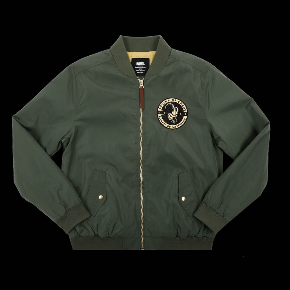 “The Loki Legion of Chaos Bomber Jacket features an embroidered ‘Legion of Chaos, Bound By Mischief’ emblem on the chest and back, both featuring Loki’s iconic golden headpiece. 100% polyester with ribbed knit collar, cuffs, and hem, with two front flap-snap pockets."