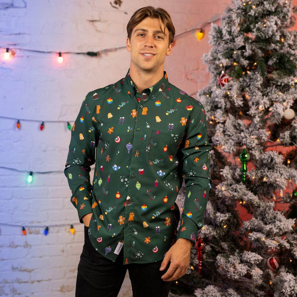 - There’s never a dull moment with “Heroic Holiday" which sees Earth’s Mightiest Heroes in ornament, gingerbread cookies, and hot chocolate forms. These colorful elements and symbols are featured against a pine green background that instantly has you thinking about Christmas trees.