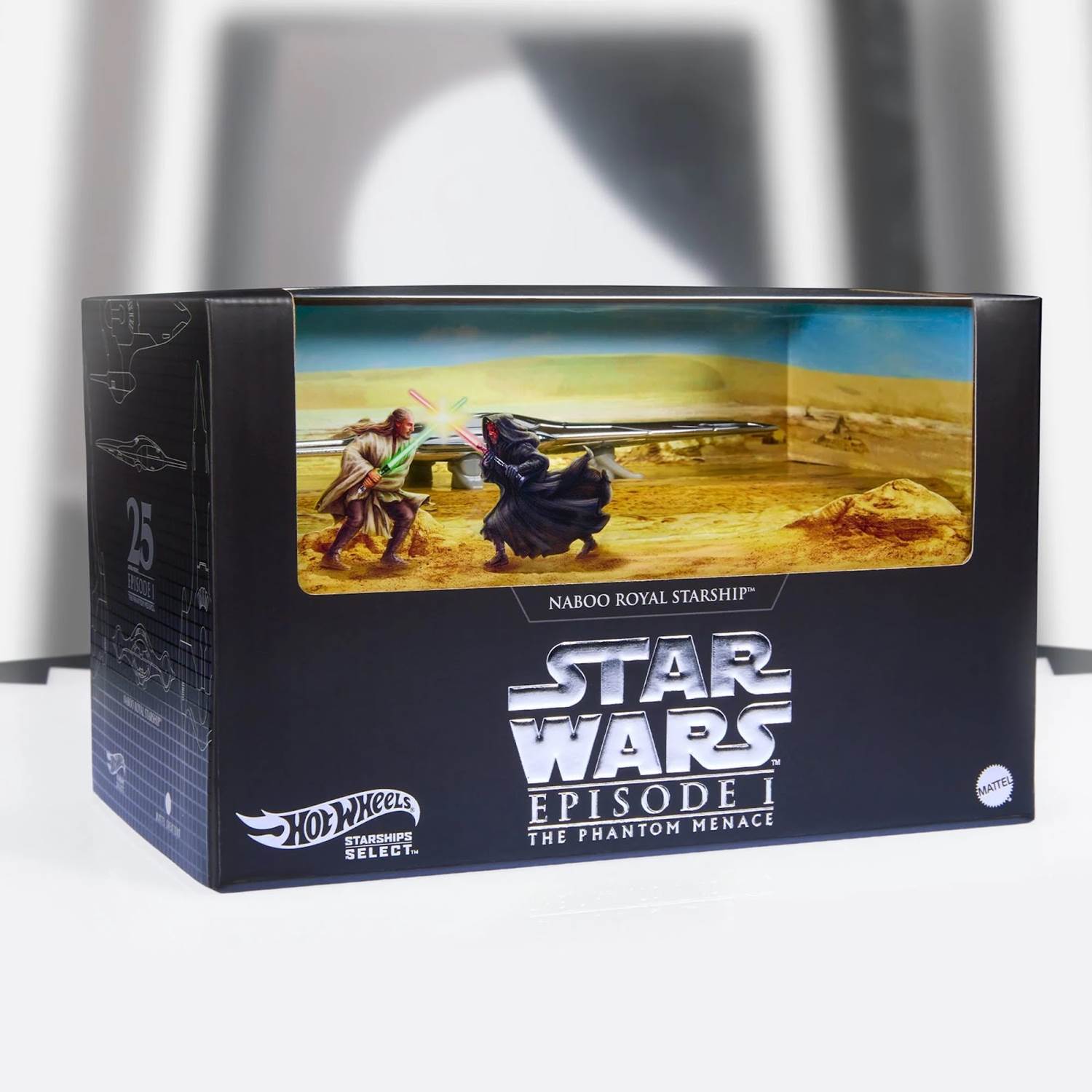 - Mattel: “Celebrating the 25th anniversary of The Phantom Menace, this die-cast Star Wars Starships Select vehicle is crafted to highlight the shining exterior of the Royal Naboo Starship. The diorama packaging showcases its elegance against the harsh landscape of Tatooine. It’s a stunning contrast, reflecting not just the sands of the desert, but also the battle between good and evil in this spectacular film."