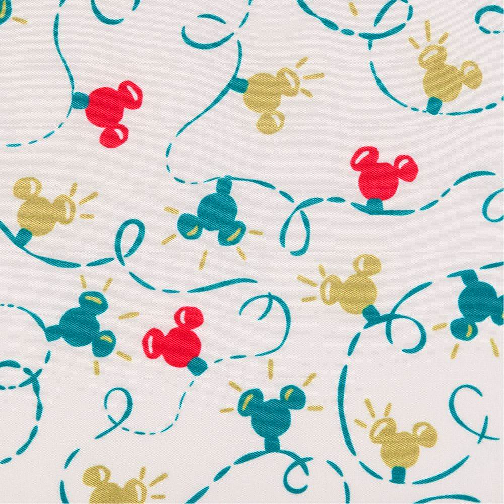 - The design is made up of a string of lights shaped like Mickey Mouse’s head. Some of the lights even have an added detail to make it seem like they are glowing brightly. The background is a pine tree green while piping, trim, the straps and handle are a complimentary holiday red.