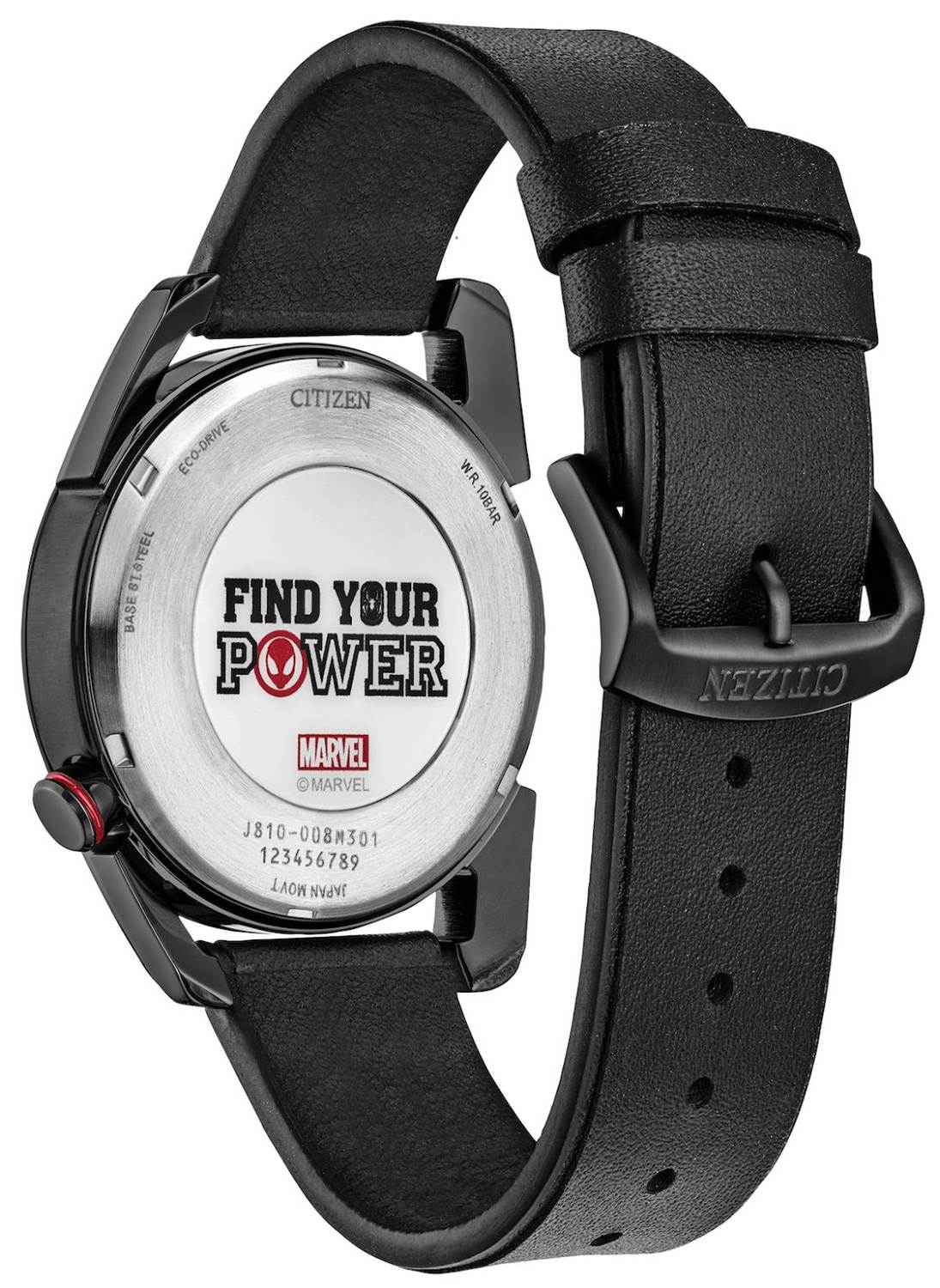 - The watch face is secured to a black leather strap accented with red contrast stitches that echo the superhero's dynamic persona and are a nod to his classic suit. Turn the watch over to discover the case back adorned with a colorful insert reading "Find Your Power."