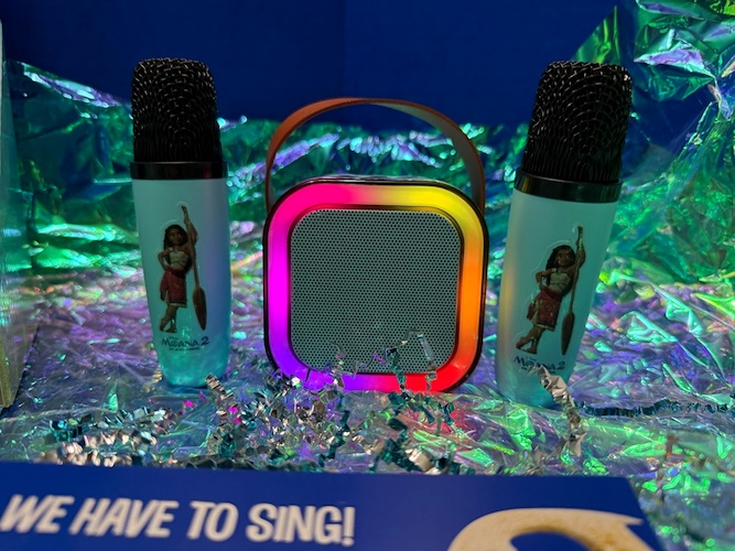 Moana 2 is a musical with songs like “Beyond" and Maui’s catchy anthem “Can I Get a Chee Hoo?" We’ve been challenged to sing along via a Bluetooth blue Iroo karaoke set, which has been decorated with Moana stickers.