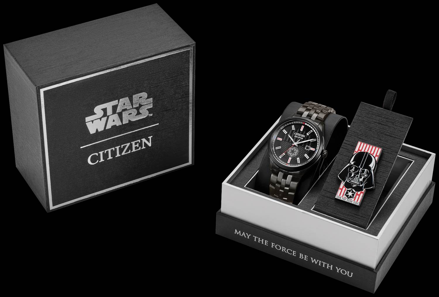 Darth Vader Returns Limited Edition Boxed Set by Citizen ($495.00) - “The new Limited Edition STAR WARS | Citizen Darth Vader Returns boxed set with collectible pin will take you fully to the dark side with bold design details that reflect one of the most complicated characters in cinema history. The watch features a 41mm black ion-plated stainless steel case and bracelet that’s constructed of both polished and brushed links. The patterning on the black dial is composed of elements from Darth Vader’s helmet and chest plate with red and blue accents, plus luminous hands, outer minute track, and Imperial symbol. The case back is engraved with ‘It’s useless to resist. Come to the dark side,’ the Dark Sith Lord’s likeness, and a unique edition number—limited to 1,977 units, the year the first Star Wars movie was released. And there’s light in all this darkness: the watch is sustainably powered by any light with Citizen’s Eco-Drive technology and never needs a battery."