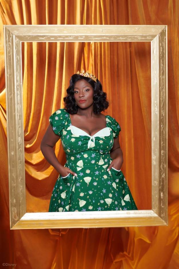 - This adorable dress is crafted in a green woven cotton and features a sweet Princess Tiana, from Disney’s The Princess and The Frog, all over print. The sweetheart neckline is accented with a fold over collar and attached bow all framed by puff sleeves. While the full swing skirt boasts side pockets.