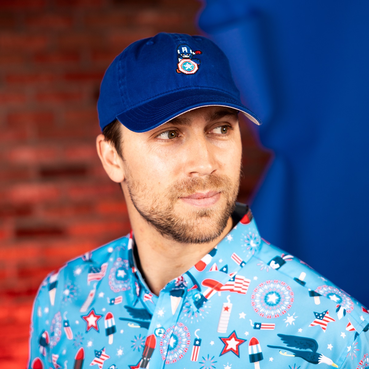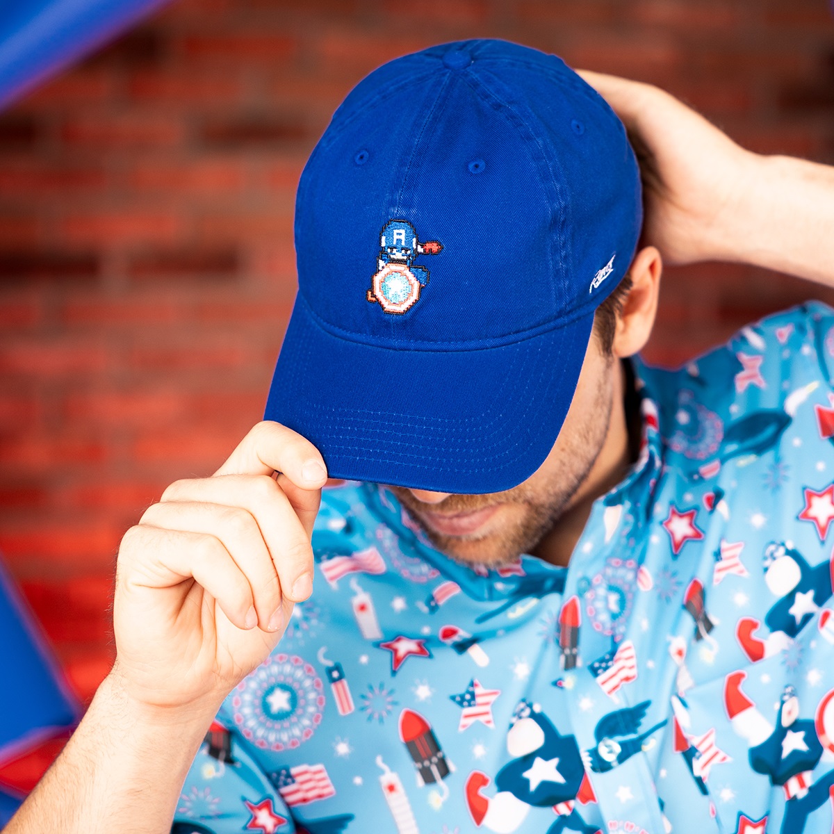 Crewneck T-Shirts are soft and comfortable for everyday wear so you’ll love sporting these threads showcasing an 8-bit Cap in action or comic style design with is name in Japanese characters! Finally, the bright blue "Pixel Patriot" Dad Hat is a fitting addition to your wardrobes and matches perfectly with that 8-bit tee.