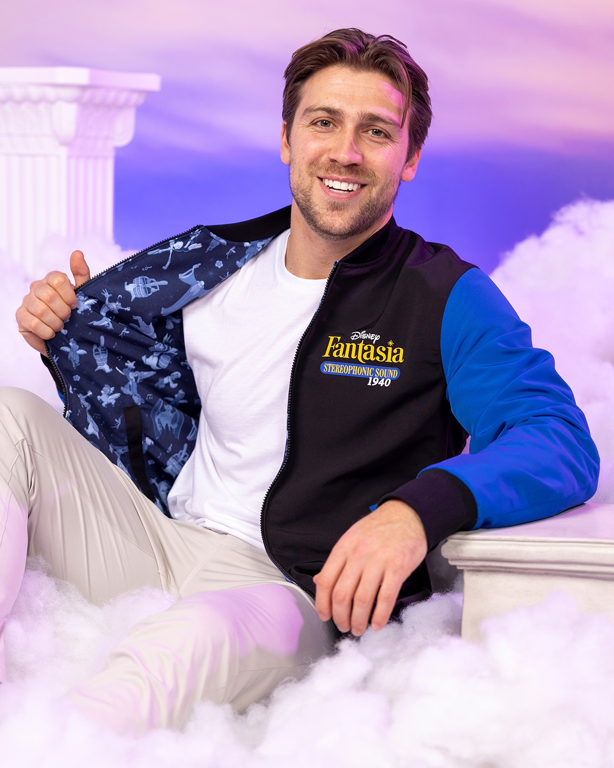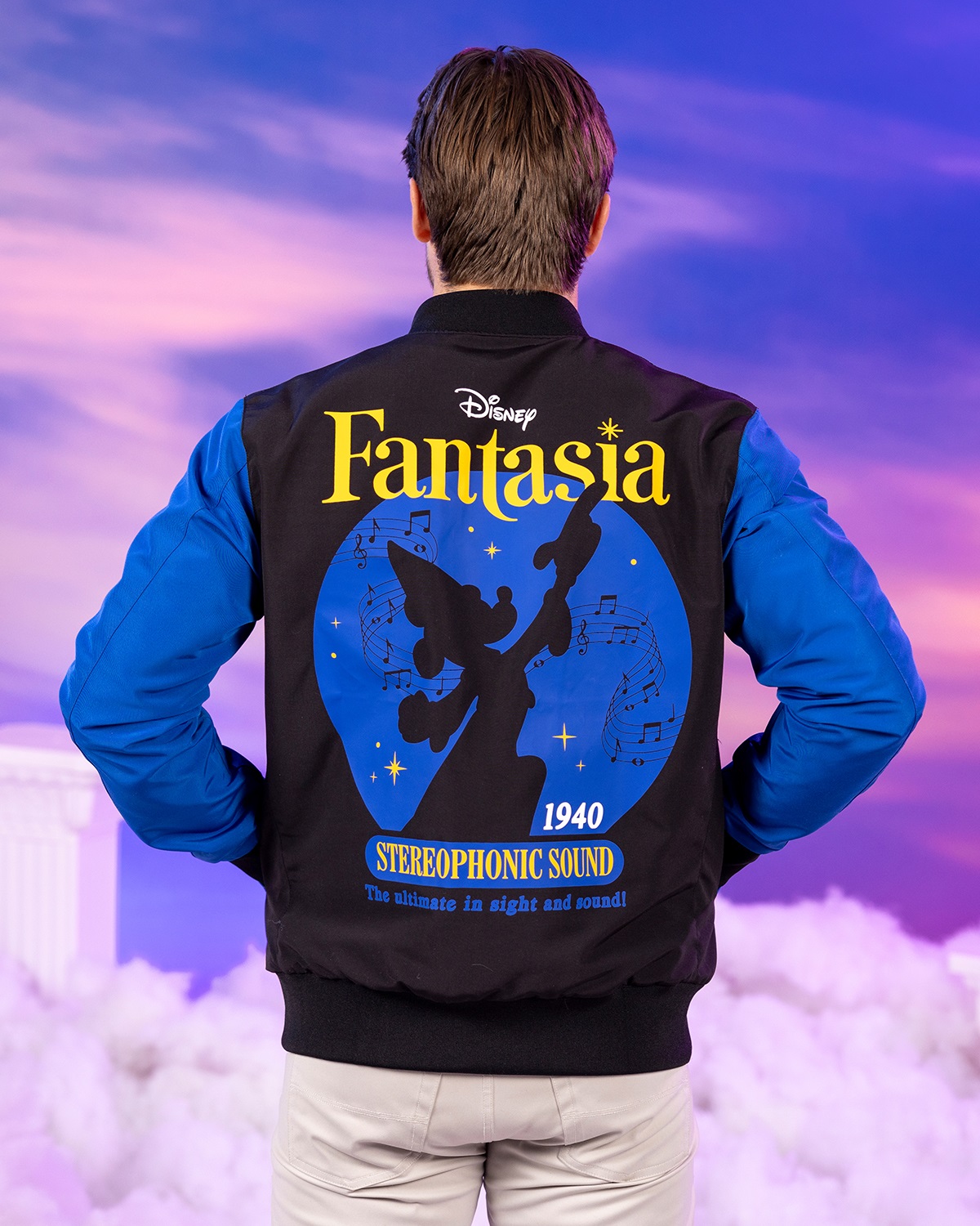 “Stereophonic Sound" sees the return of the fan-favorite Reversible Bomber Jacket style that keeps things simple with its blue and black color scheme. Mickey’s silhouette and the film’s title are featured on one side, and the other is a blue-shaded pattern featuring Yensid, Mickey, enchanted brooms, pegasi, and more.